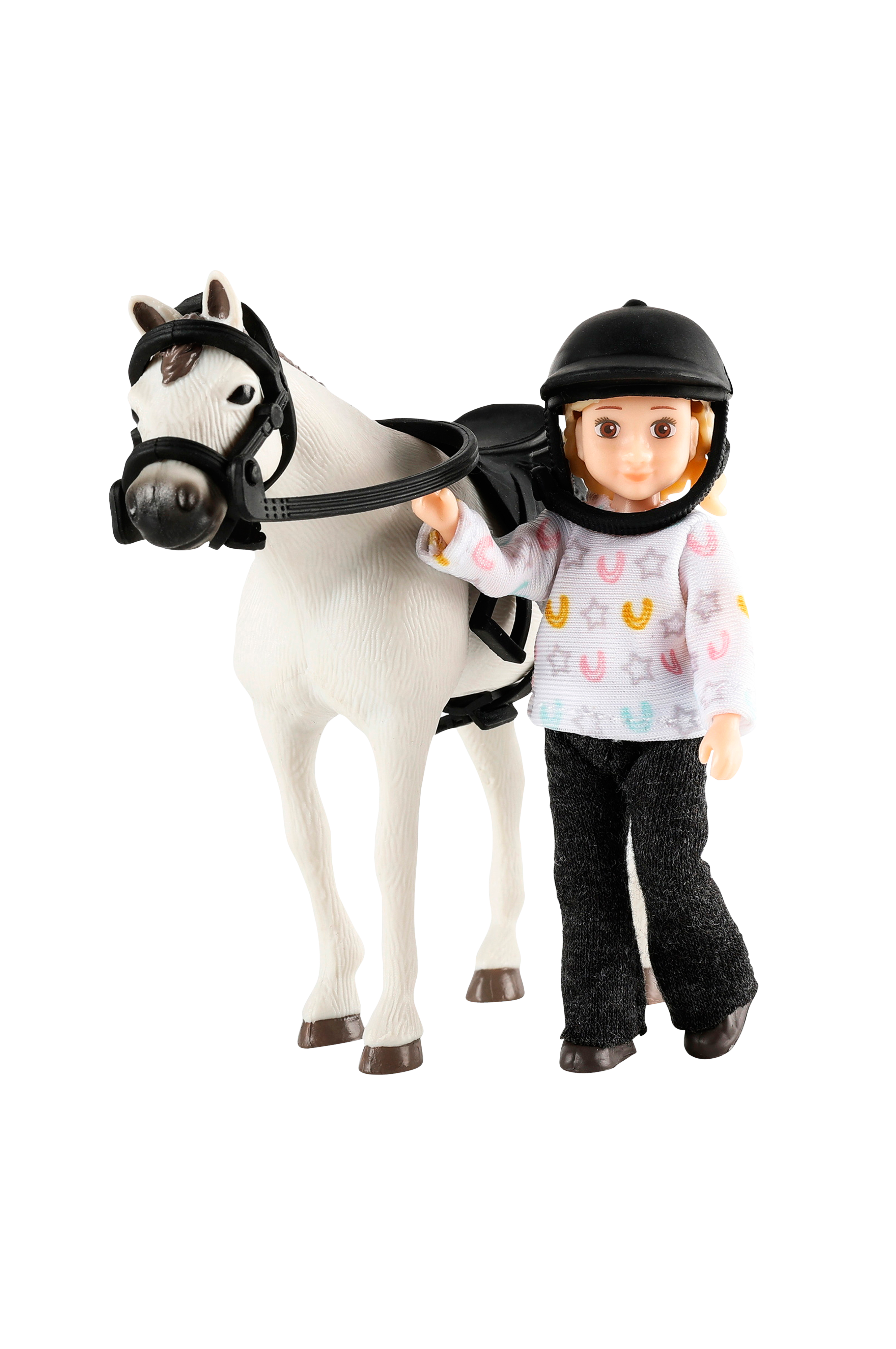 Dukkehusdukke med hest, ridehjelm, sadel og trense.