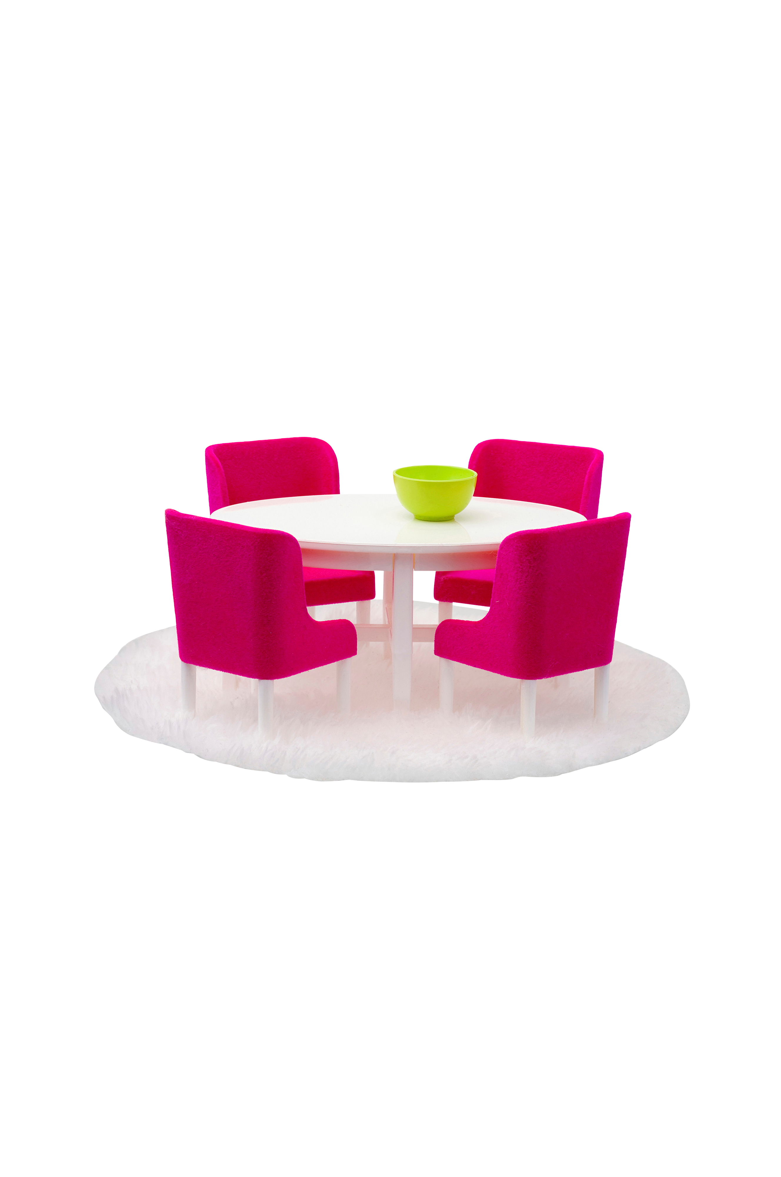 Lundbys elegante spisebordssæt i en herlig farve som pifter spisepladsen op! Saml familien Lundby og lad dem tage plads om det hvide, ovale bord i hver sin lækre cerisefarvede spisebordsstol.