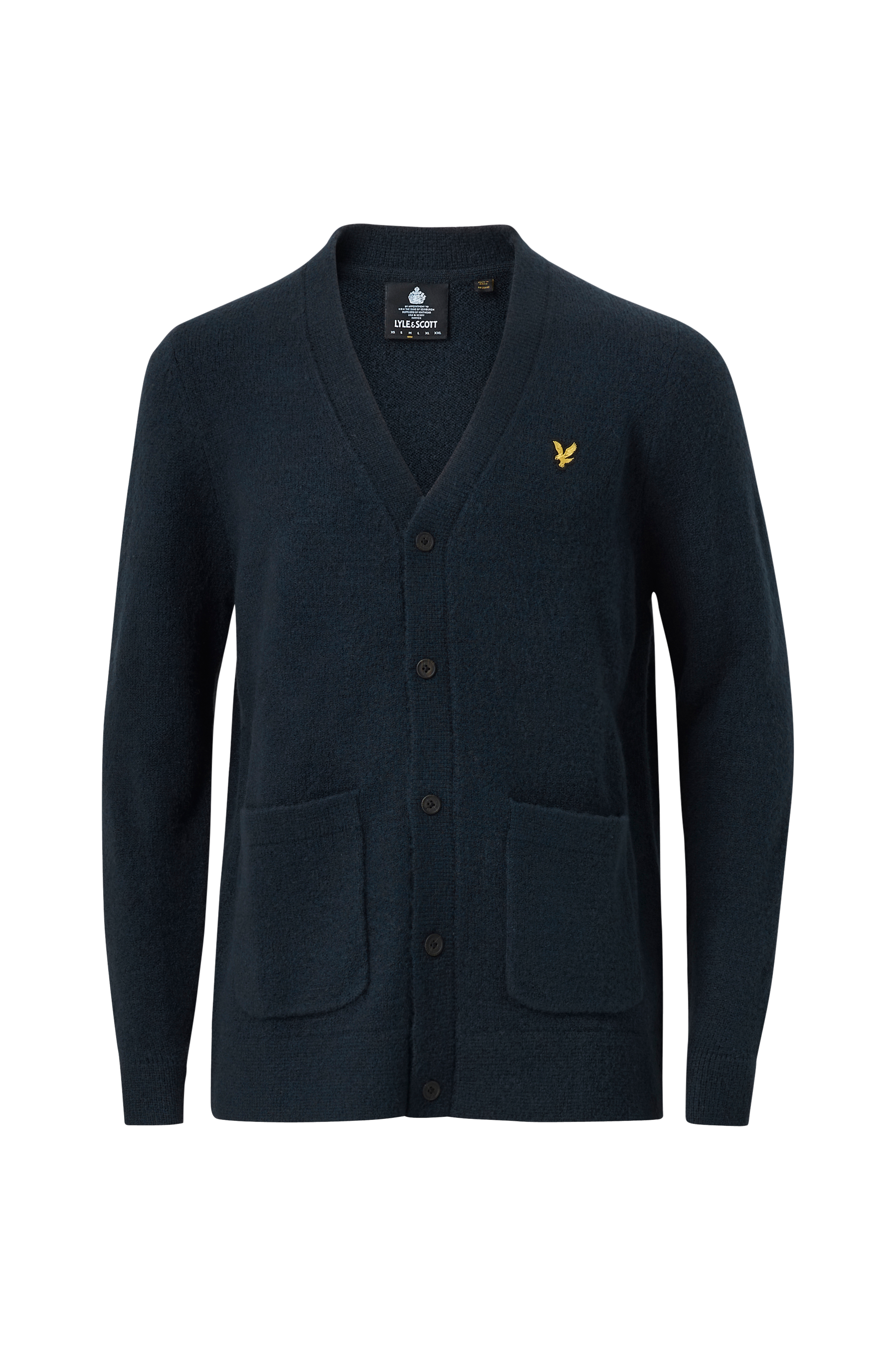 Strikket cardigan med blødt børstet overflade. V-formet halsudskæring og knapper. Påsyet, broderet logo på brystet. To knapper. Elastisk rib i ærmekanterne og forneden.