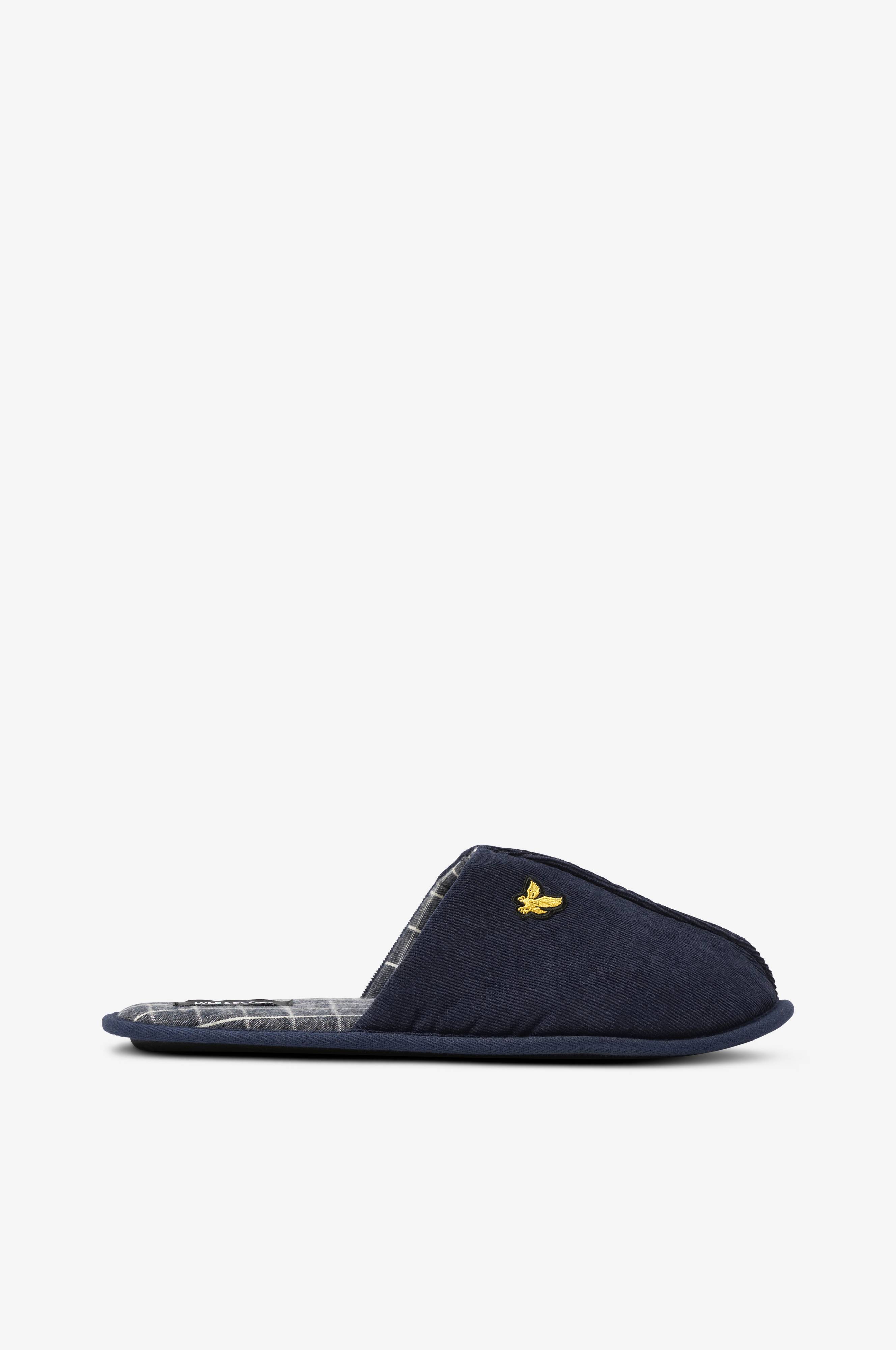 Hjemmesko i blød fløjl med ternet tekstilfor. Blødt polstret fodseng. Broderet logo på oversiden.