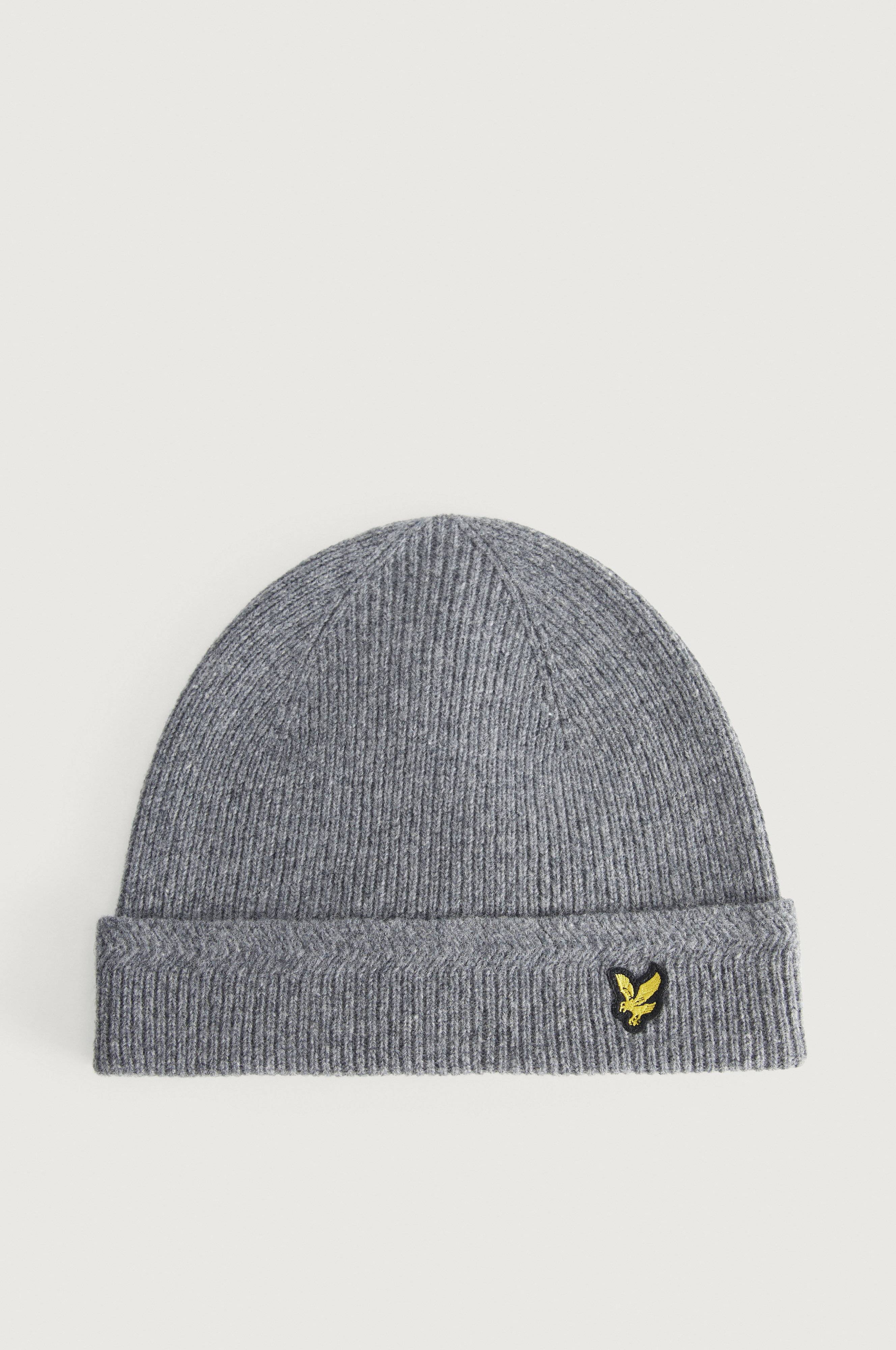 Ribstrikket hue fra Lyle & Scott i blød uldblanding. Huen har broderet logo på opslaget.