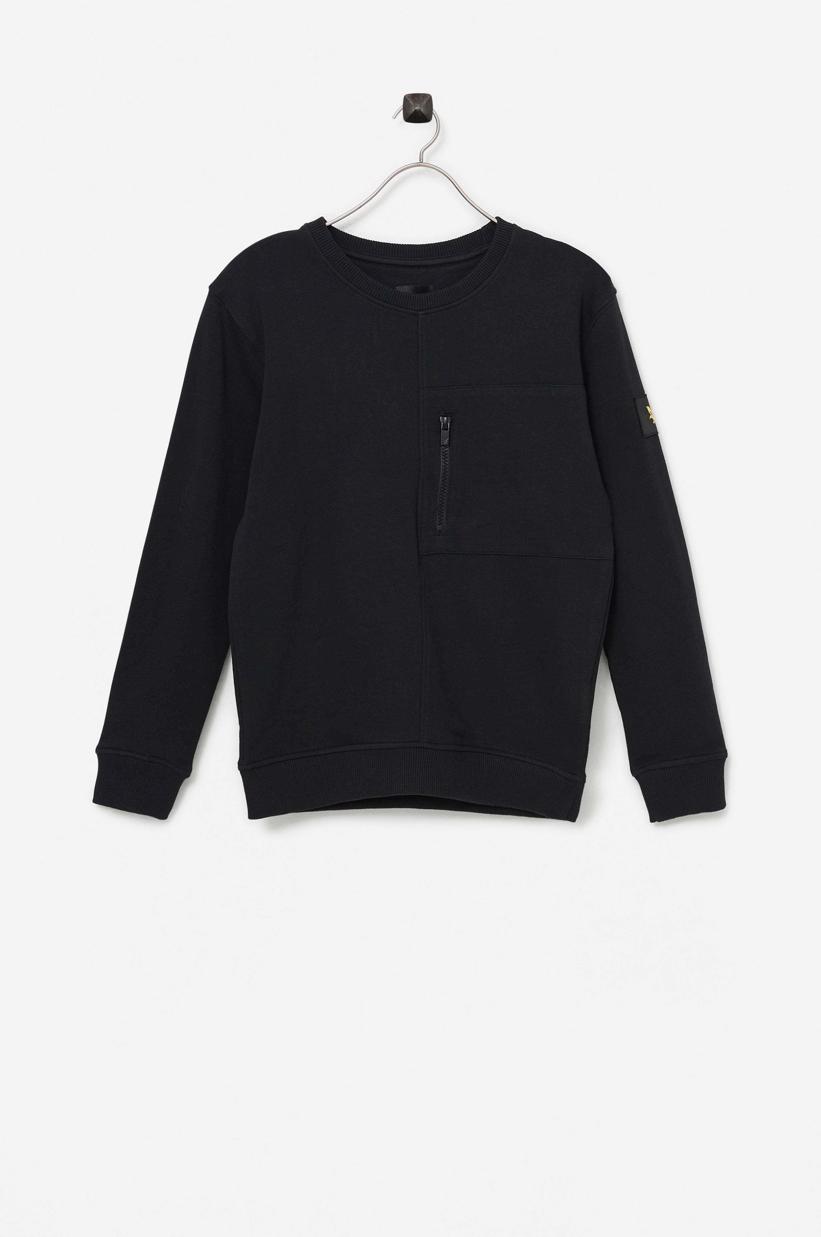 • Rund, ribbet halsudskæring• Lomme med lynlås foran• Påsyet lap på det ene ærme• Ribmanchetter ved manchetterne og nederst