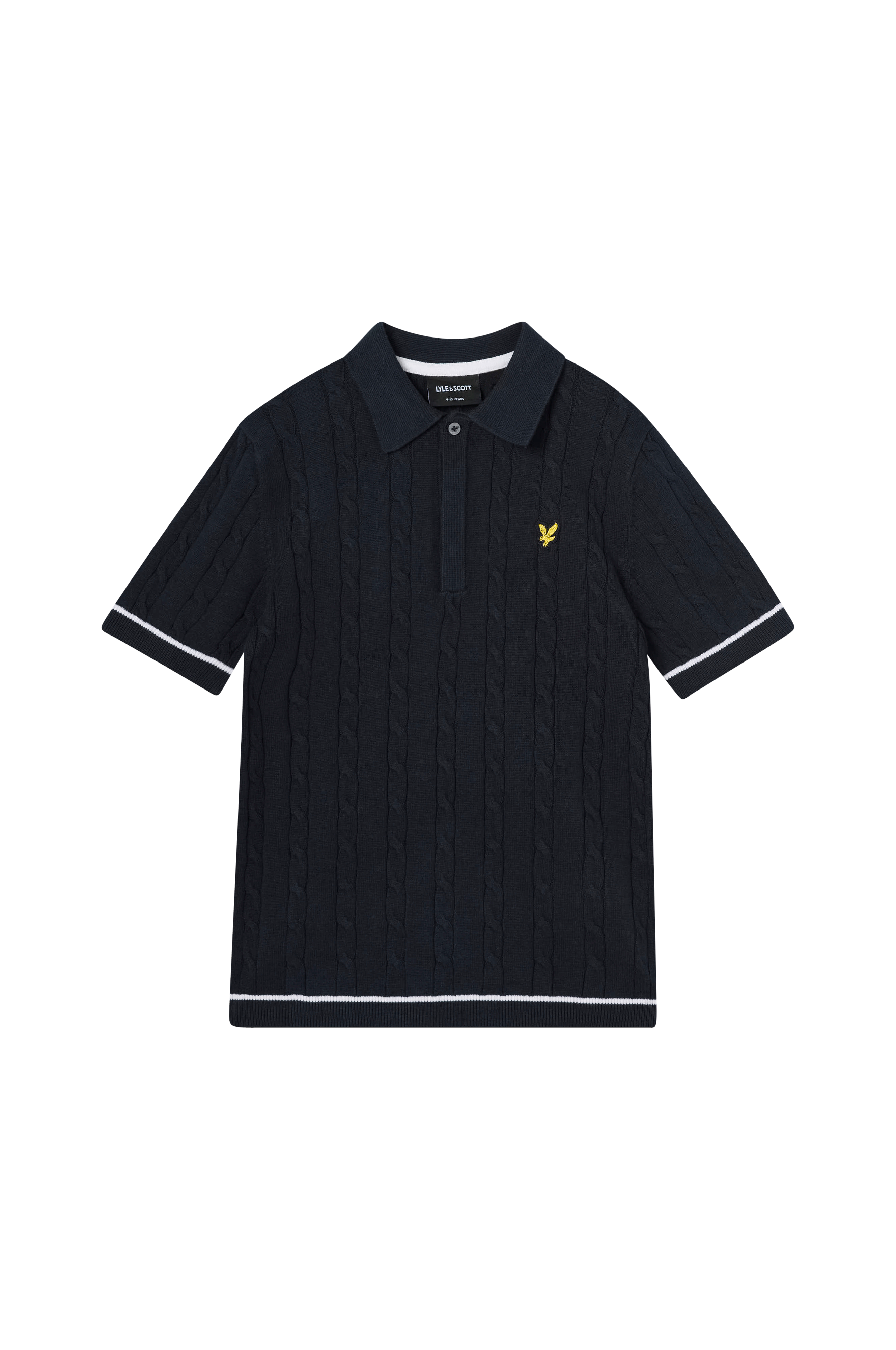 • Kabelstrikket trøje med korte ærmer• Ribbet krave• Tre knapper• Ribstrik ved manchetterne og nederst