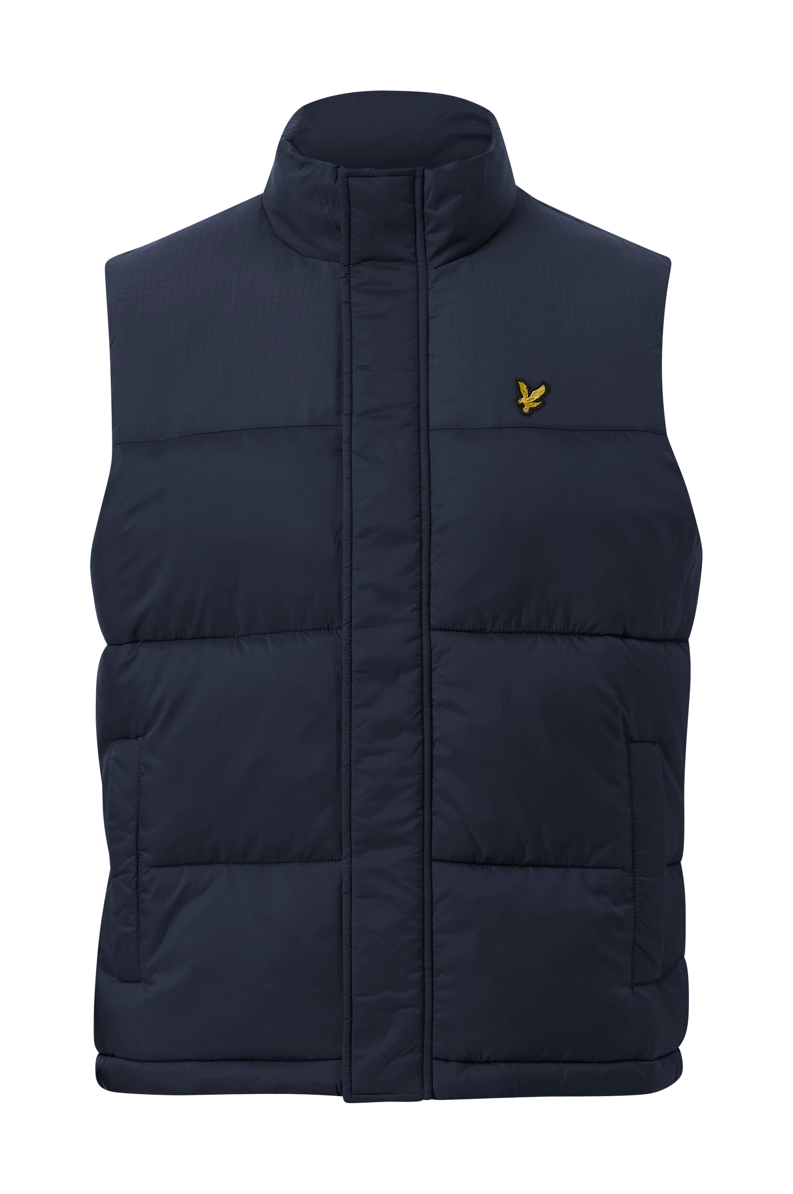 Vest Wadded Gilet fra Lyle & Scott er quiltet og vatteret dynevest med lav vægt og åndbarhed. Høj, vatteret krave. Lynlås og overfald over lynlåsen med trykknapper. To lommer og en inderlomme, alle med skjult trykknap. Broderet logo på brystet. Længde ca. 70 cm i str. M.