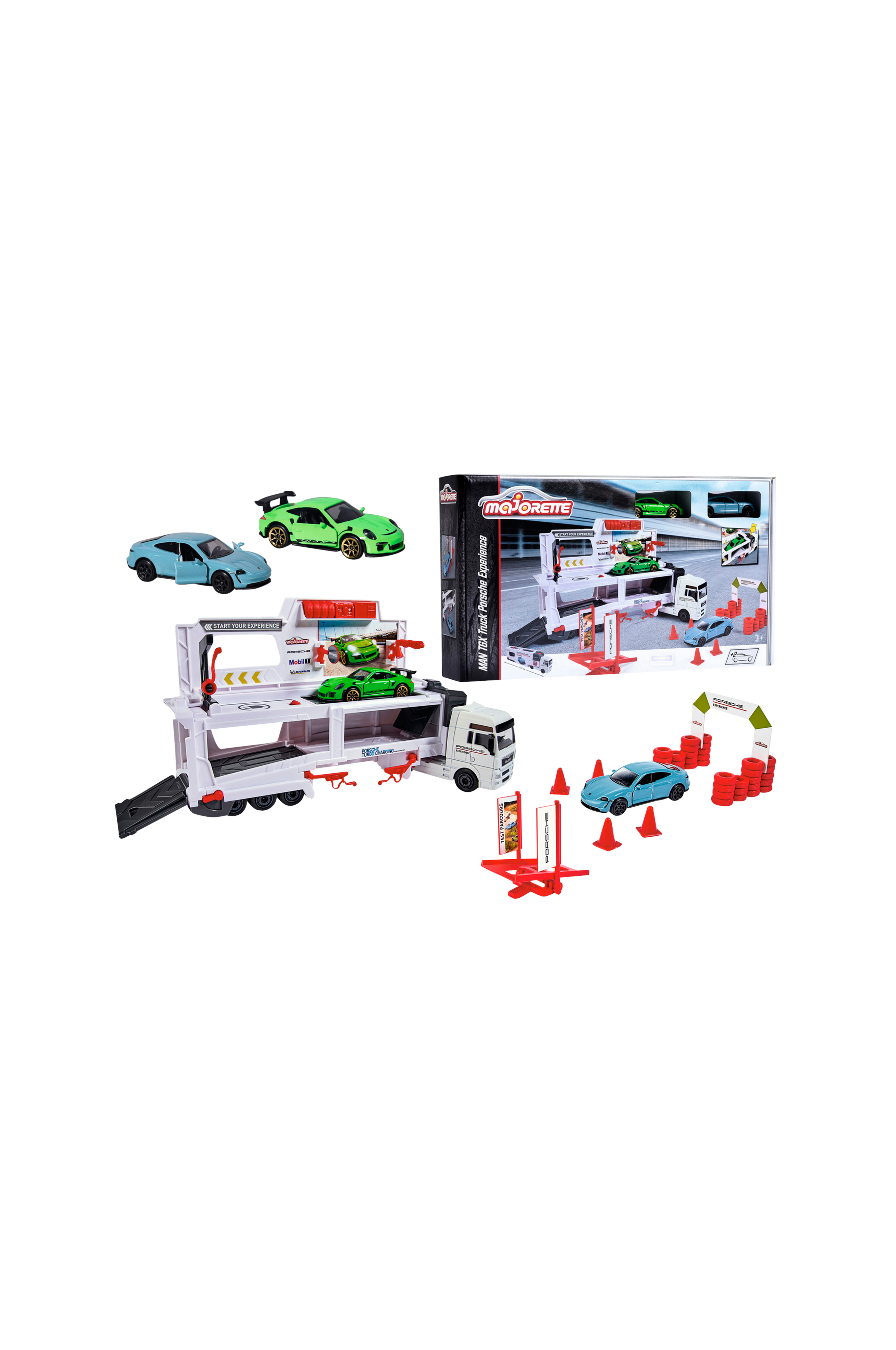 Majorette legetøj med MAN TGX lastbil (27 cm) med friløb, aftageligt tilbehør, oplukkelige dele og diverse løfteraketter inklusive 2 Porsche biler i metal med friløb (7,5 cm).