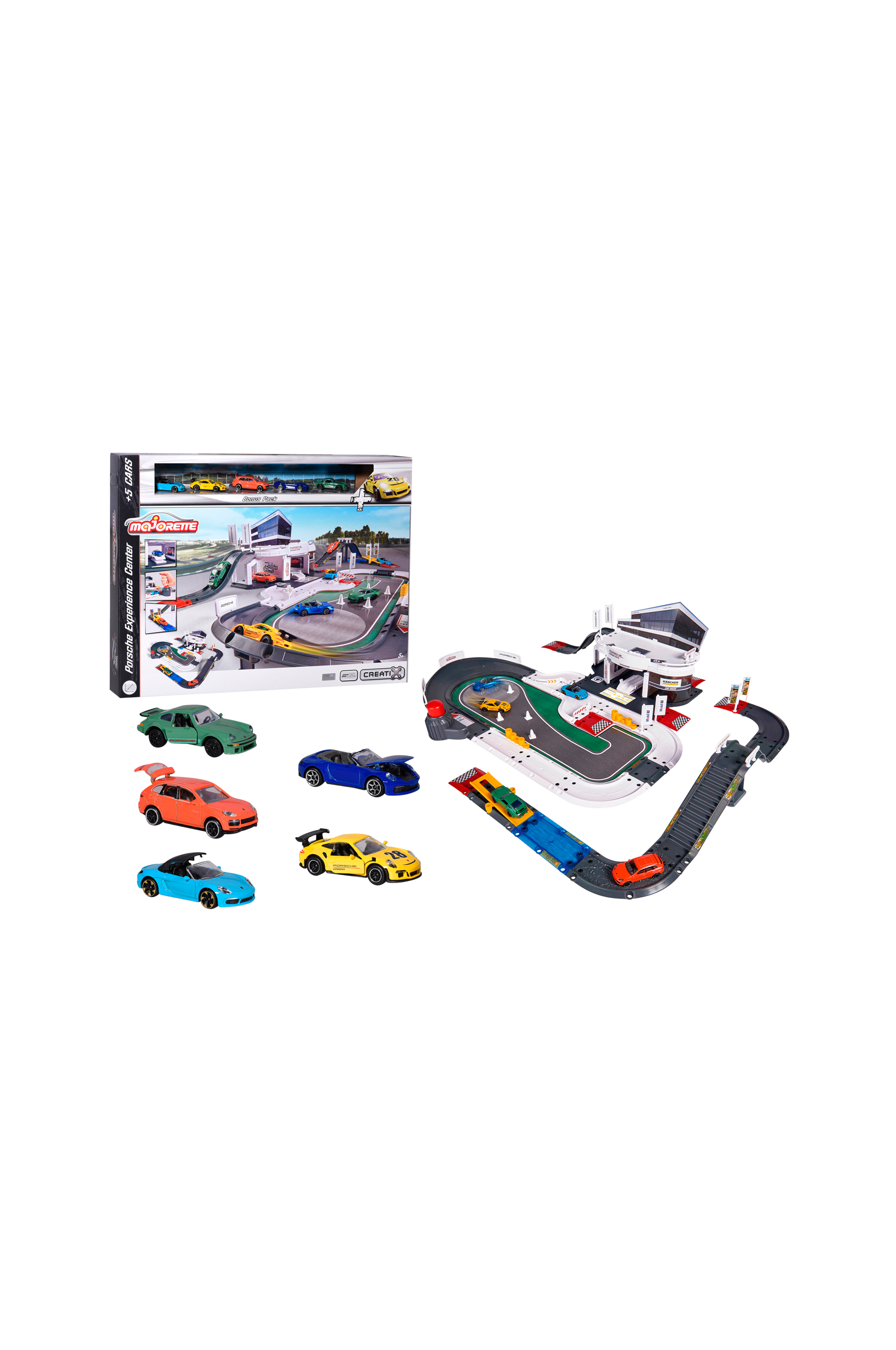 Porsche legesæt fra Majorette baseret på Original Porsche Center (70 x 60 x 22 cm) med ladestation, forskellige baner (60 x 33 x 10 cm), driftkurve, affyring, billift og en bilvask.5 køretøjer i metal med frihjul (7,5 cm) medfølger.