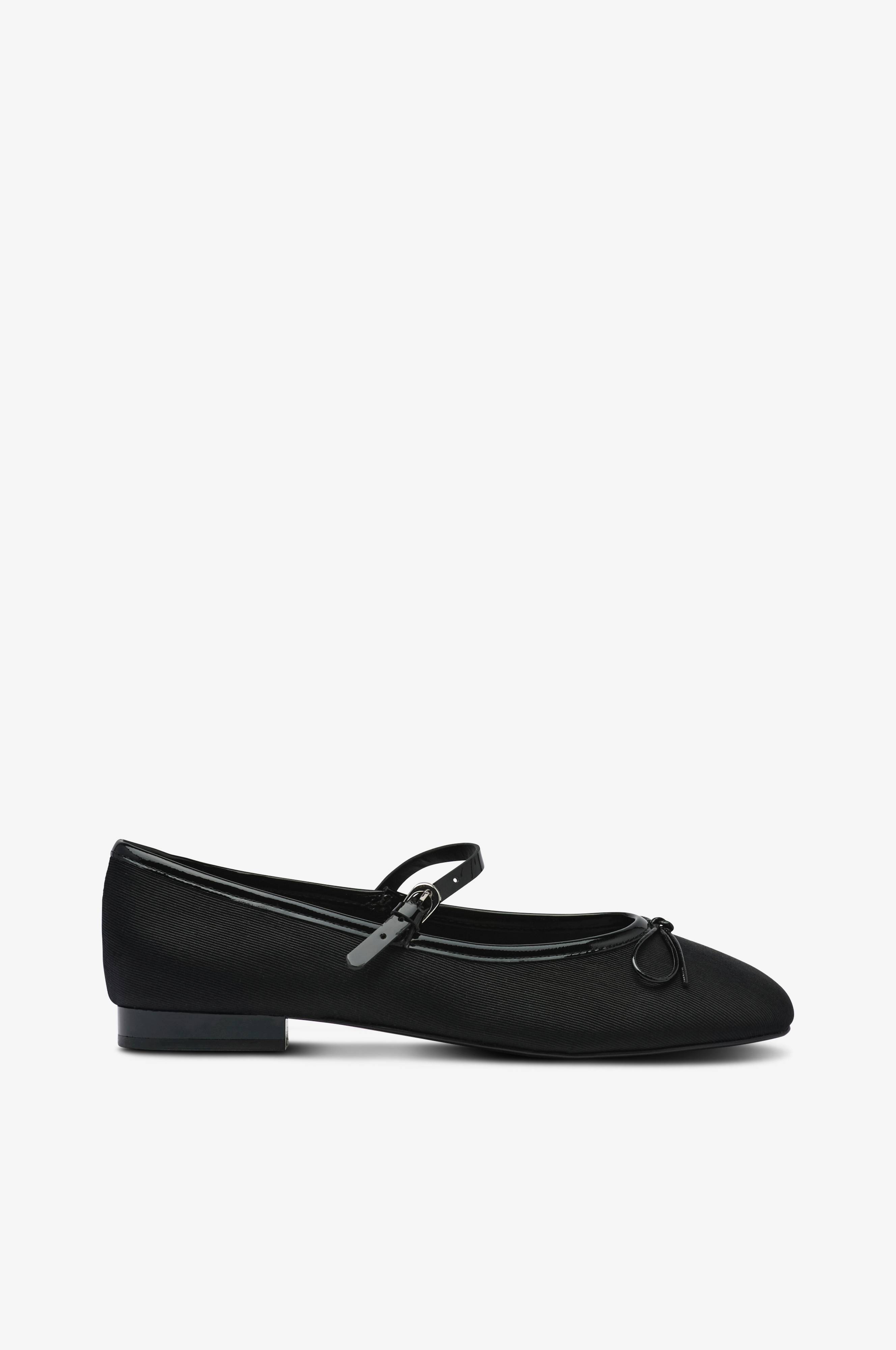• Ballerinasko i tekstil• Dekorativ sløjfedetalje på foden• Patent, justérbar rem med sølvfarvet metallukning• Lav, patent hæl