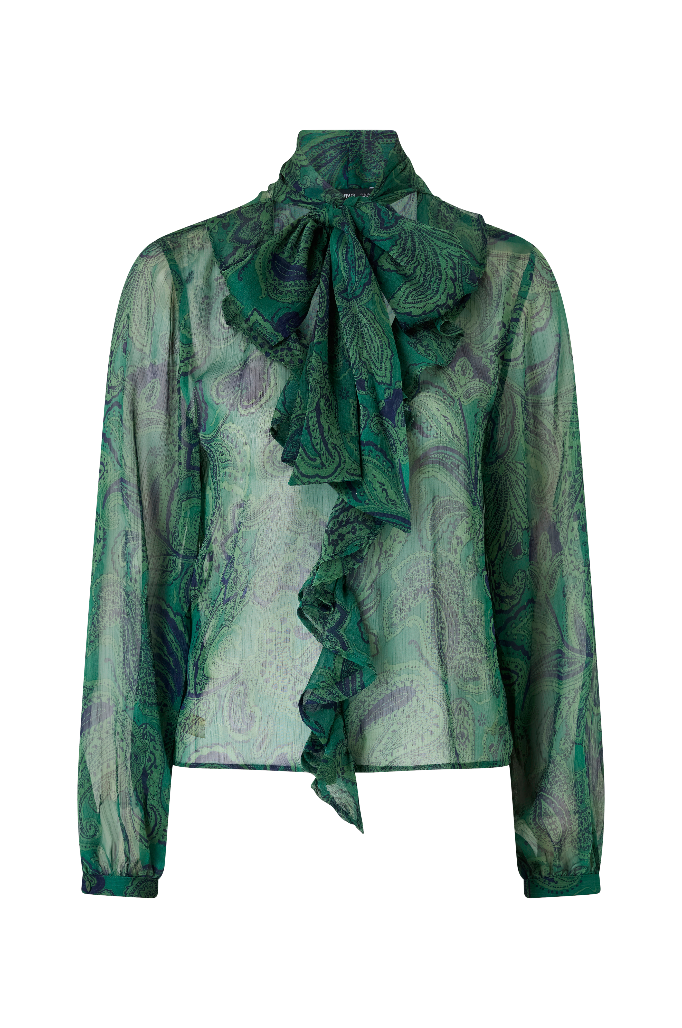 • Semitransparent bluse i chiffon• Volant på halsen og hele vejen ned• V-formet halsudskæring med bindebånd på toppen• Lange ballonærmer med tynde manchetter