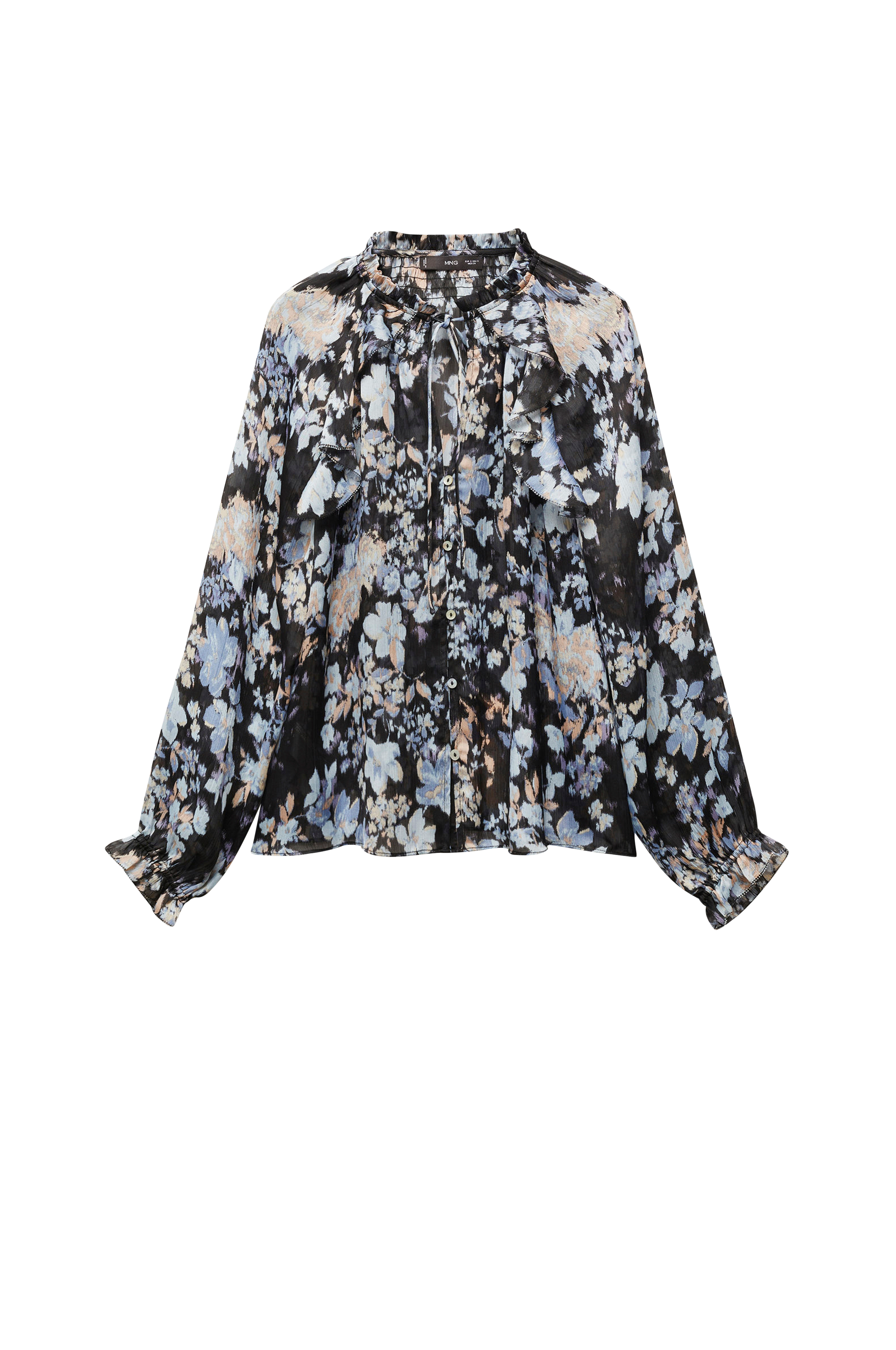 • Transparent bluse i chiffon• Knapper foran• Bindebånd i halsen• Ballonærmer med volant ved manchetterne