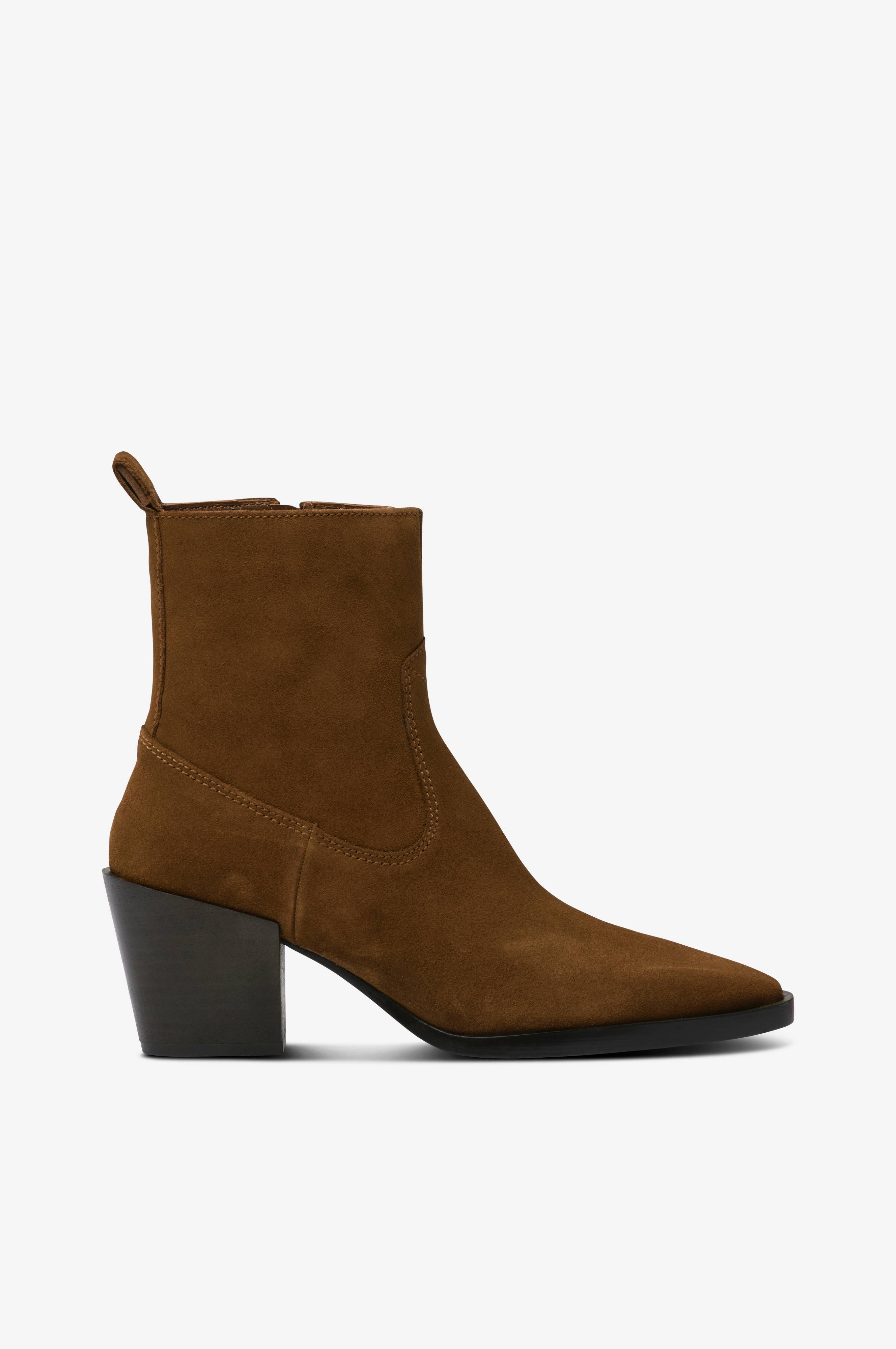 Boots i skind eller ruskind. Inspireret af cowboyboots med en skrå blokhæl, spids tå og sømme på skaftet. Lynlås og trækstrop som gør støvlen let at tage på.Skafthøjde ca. 13,5 cm i str. 37.