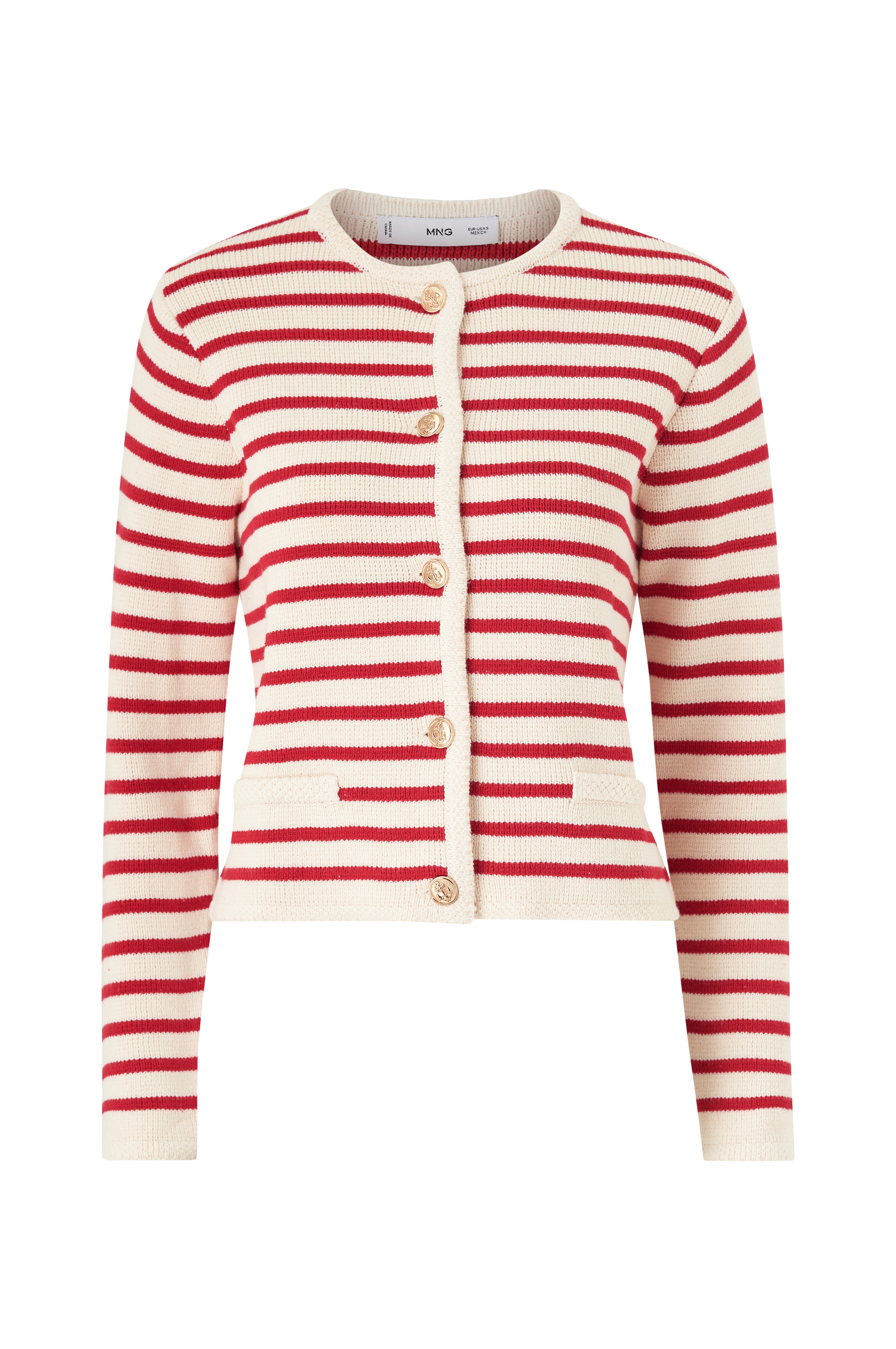 • Strikket cardigan med lange ærmer• Rund halsudskæring• Knapstolpe foran med guldfarvede, dekorative knapper• To snydelommer foran