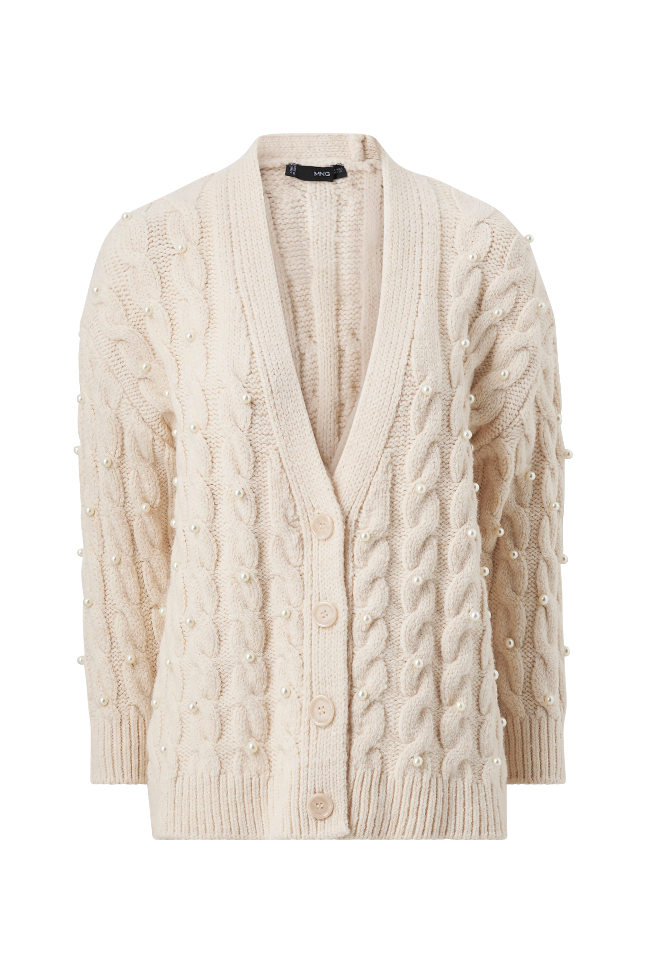 • Kabelstrikket cardigan med påsyede perler hele vejen rundt • Knaplukning • Ribmanchetter ved manchetterne og nederst • Produktet indeholder genindvundet materiale, som genbruges for at reducere mængden af affald samtidigt med at der ikke anvendes nye ressourcer.