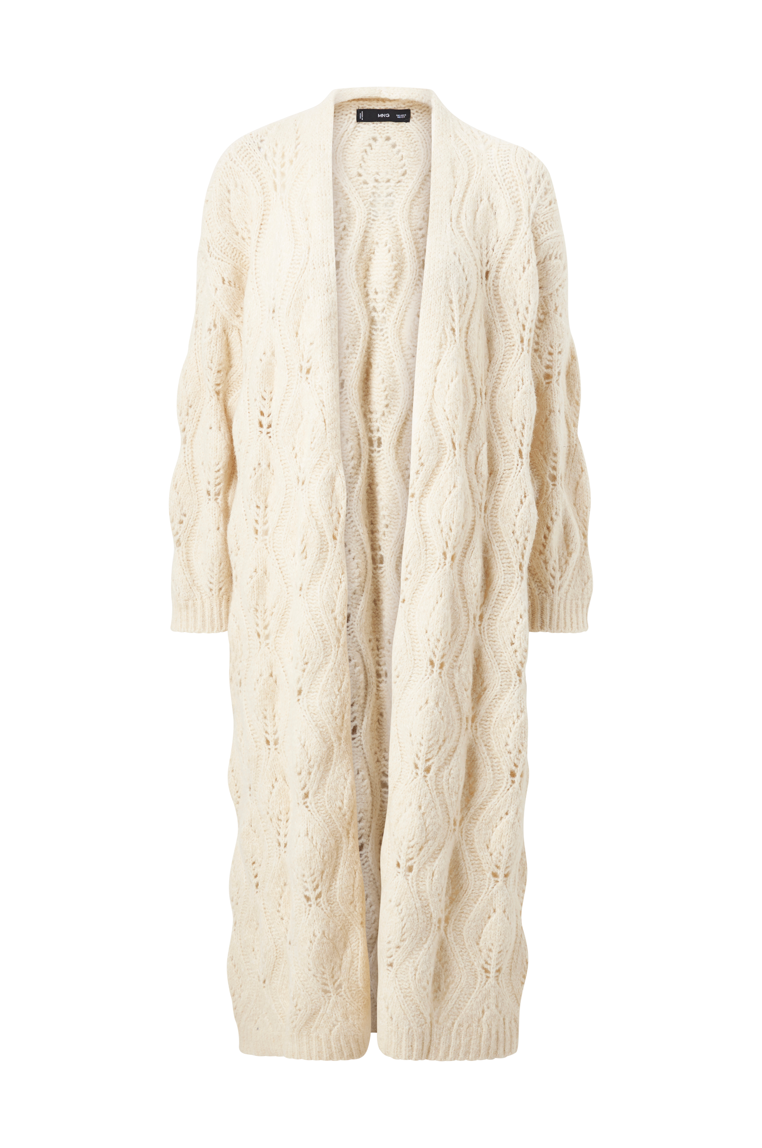 • Lang, strukturstrikket cardigan• Åben model• Grovstrikket kvalitet