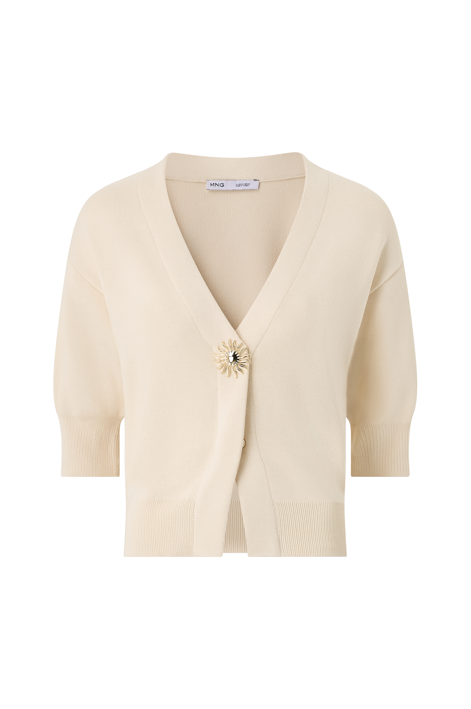 • Fintstrikket cardigan med halvlange ærmer• V-formet halsudskæring• Trykknapper foran med dekorativ, guldfarvet sol• Ribmanchetter ved manchetterne og ved nederste kant