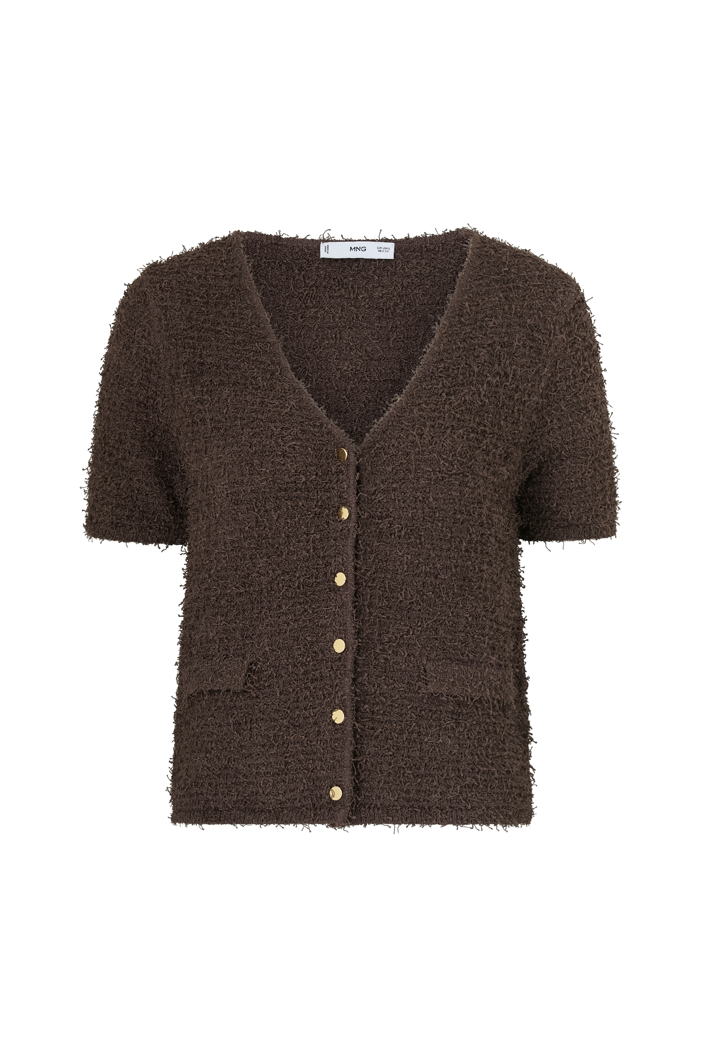 • Kortærmet cardigan med v-formet halsudskæring• Guldfarvede knapper foran• Snydelommer foran