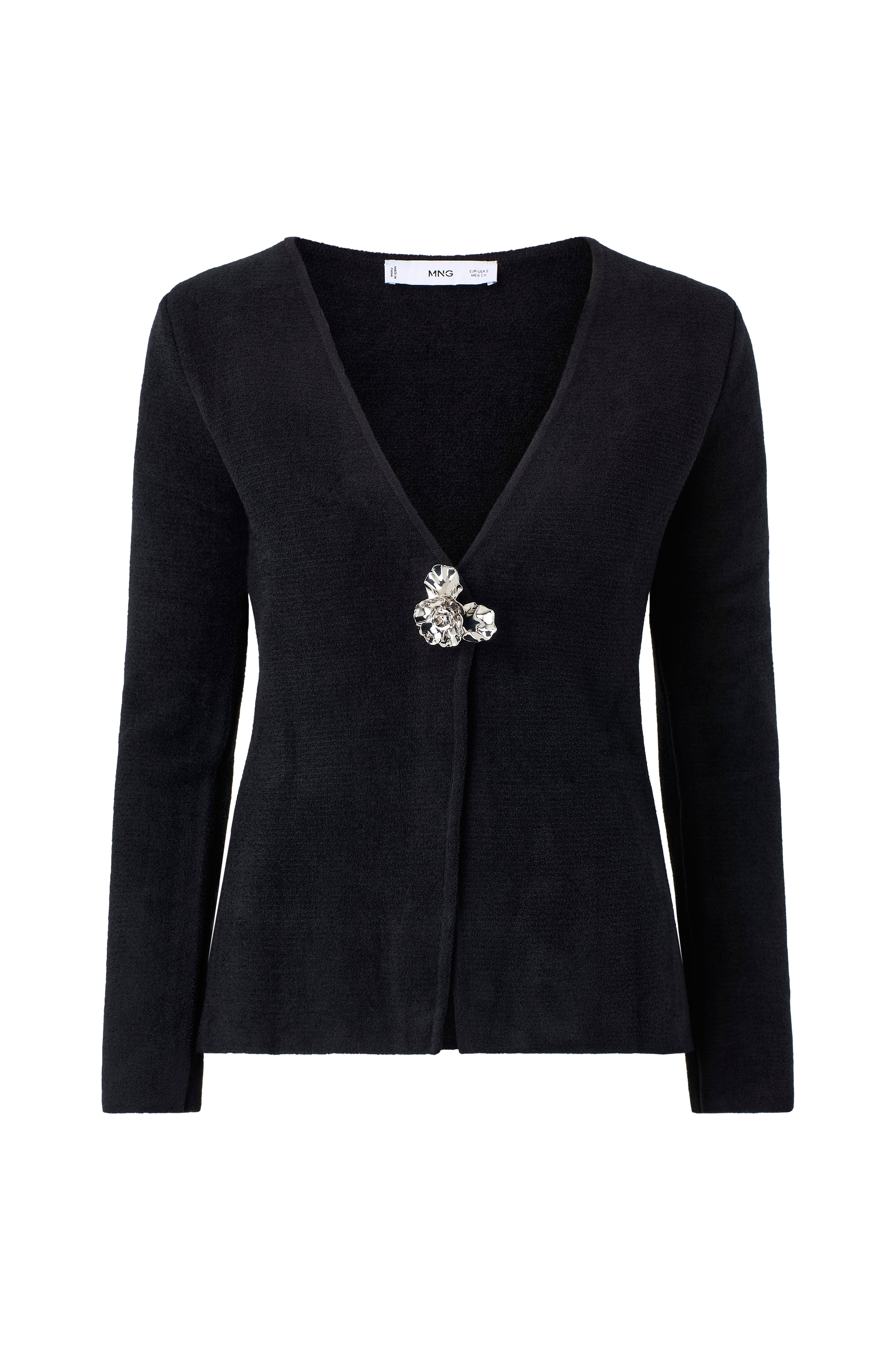 • Blød, fintstrikket cardigan i viskoseblanding• V-formet halsudskæring• Dekorativ, sølvfarvet blomsterapplikation foran• Lange, smalle ærmer
