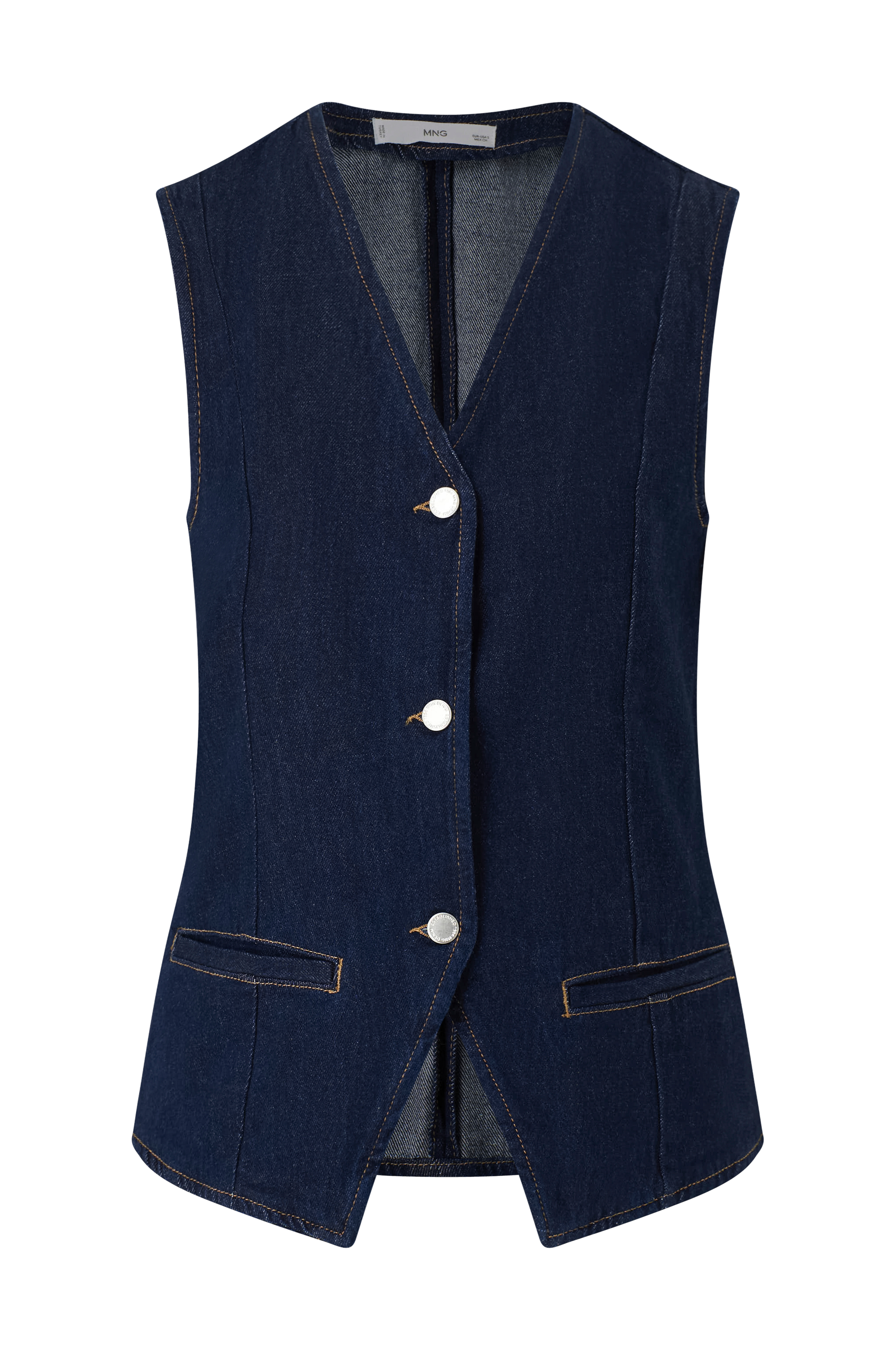 • Denimvest i bomuldsdenim• Metalknapper• To lommer