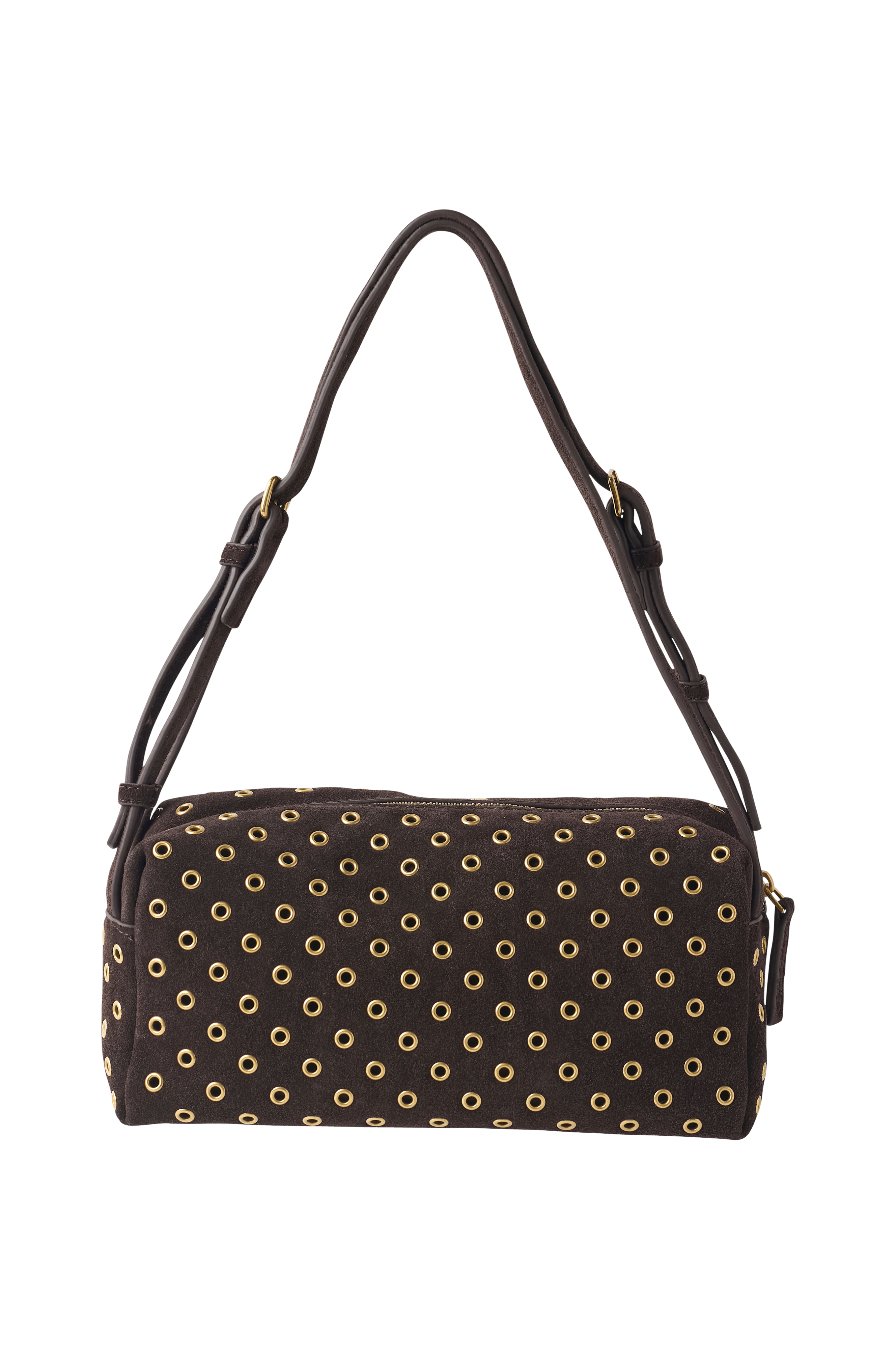 • Håndtaske i ruskind med dekorative snørehuller• To justérbare skulderstropper• Hovedrum med lynlåslukning• Tekstilforing