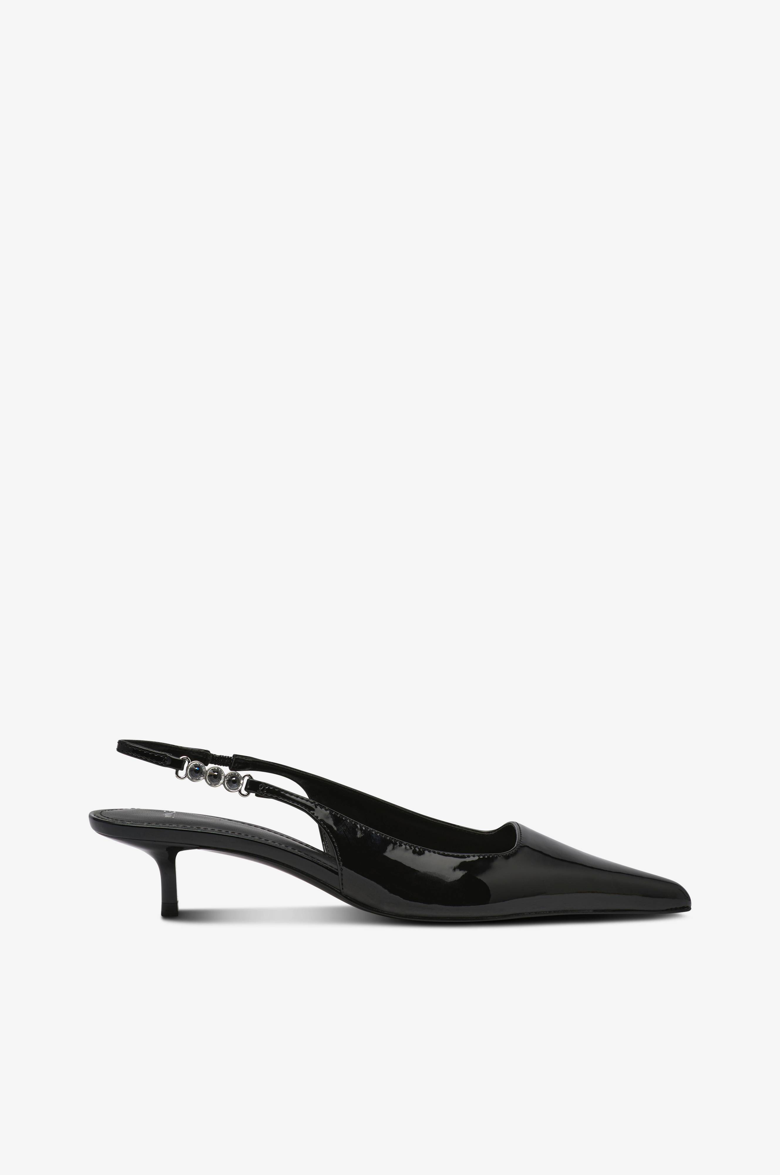 • Spidse højhælede sko i skinnende PU med stilethæl• Rem bagpå med funklende detalje og kort elastik• Afrundet, firkantet form oppe foran• Hælens højde: 3 cm