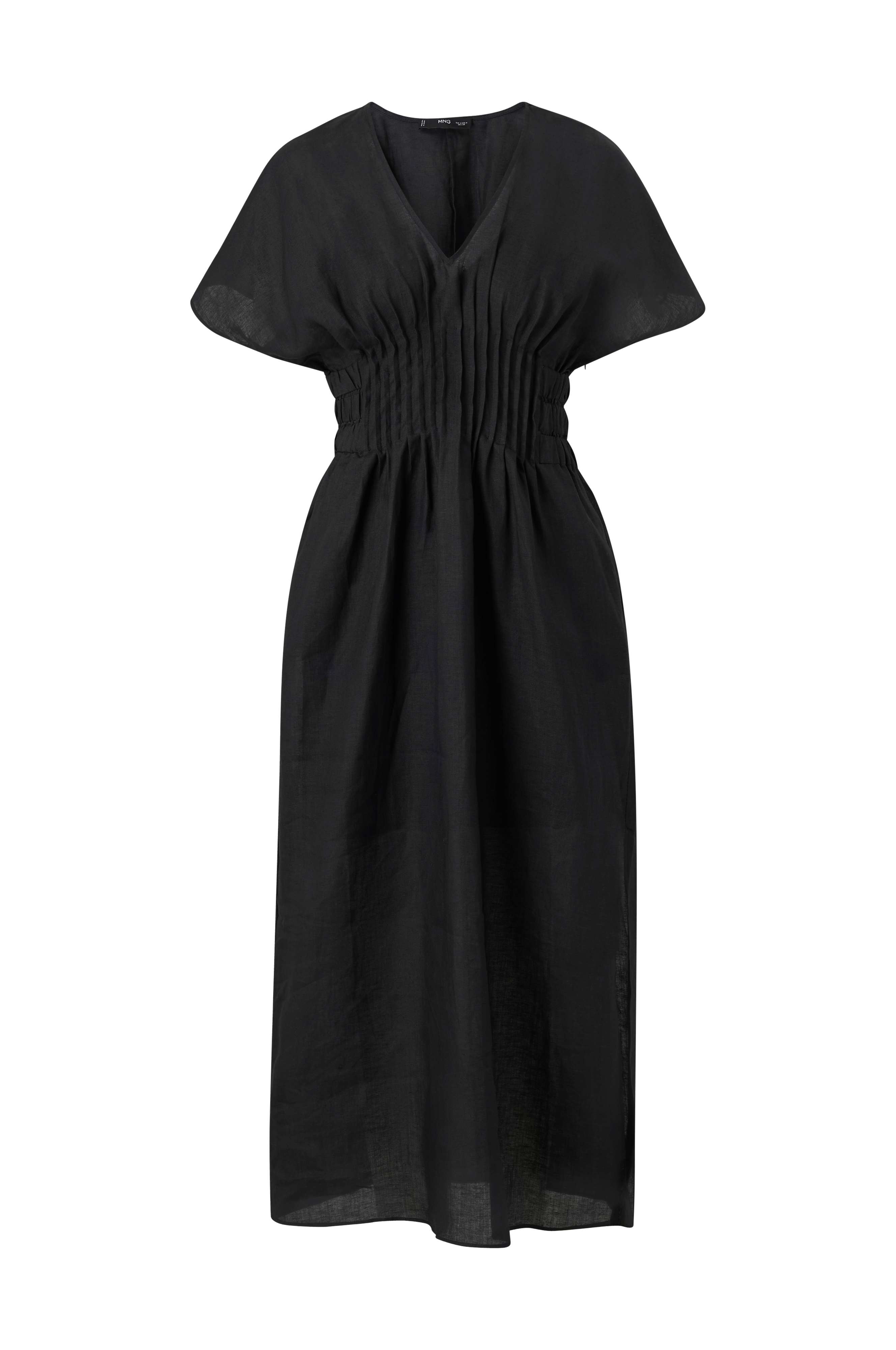 • Kjole i hørblanding • V-udskæring • Korte, brede ærmer • Bølgeformede detaljer foran og bagpå • Smock i siderne af taljen • Skjult lynlåslukning i den ene side • Aftagelig underkjole • Normal pasform • Længde: 135 cm i størrelse S