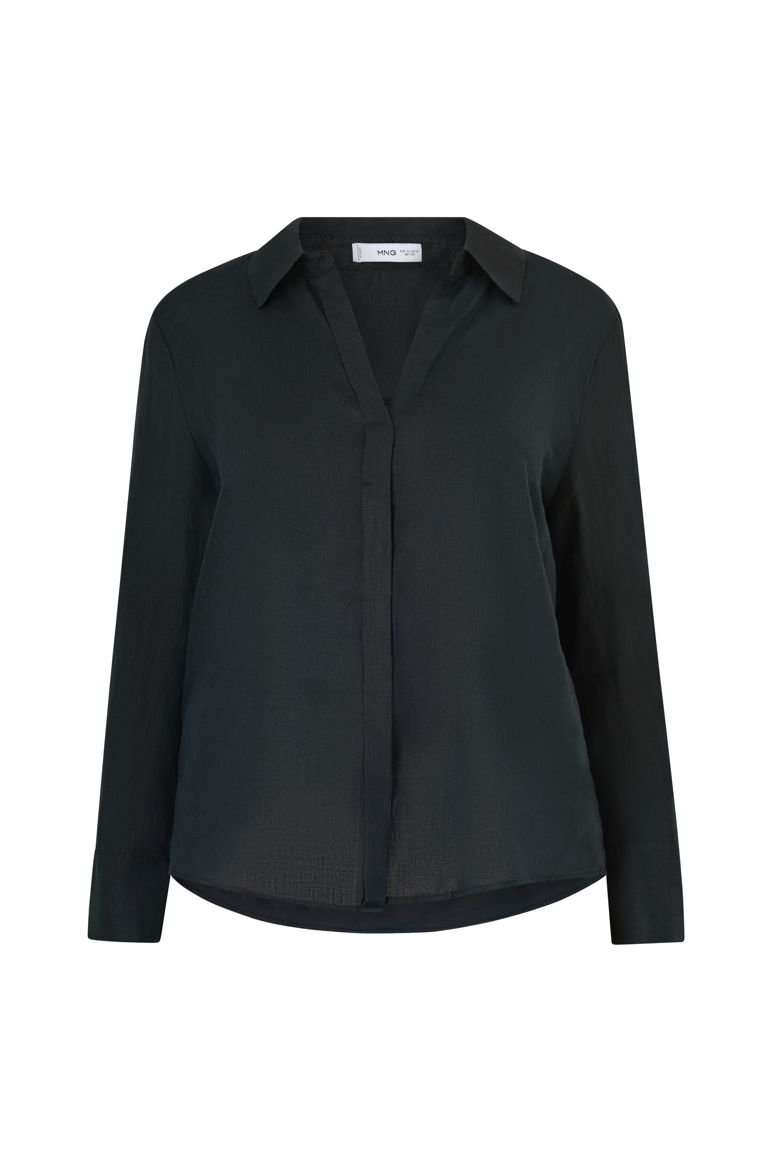 • Skjorte i hør med krave og v-udskæring• Skjult knaplukning foran foran• Lange ærmer med manchetter• Afrundet søm• Plusstørrelser