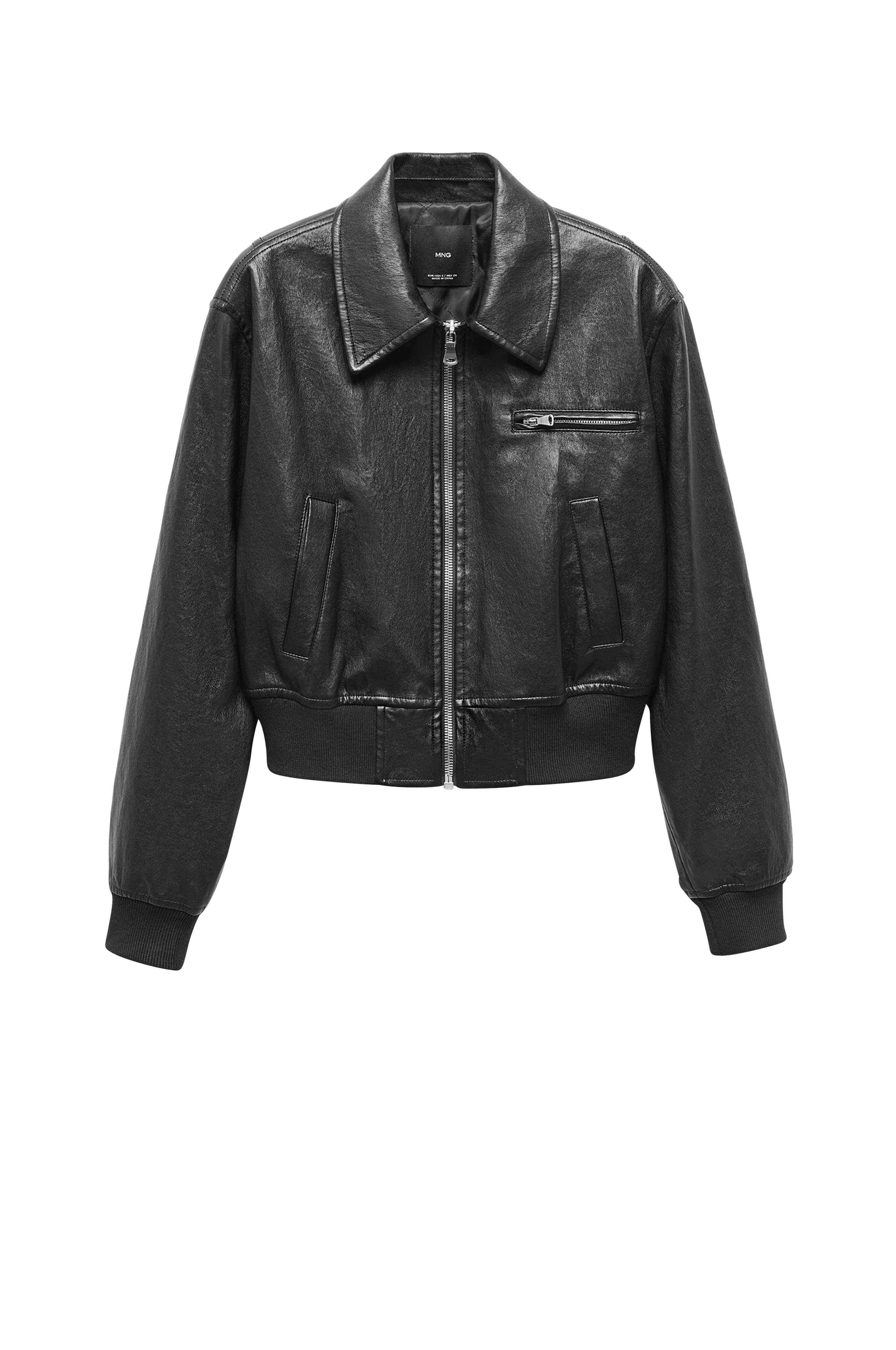 • Bomberjakke i imiteret læder med krave• Indlagte lommer• Brystlomme med lynlås• Ribmanchet ved manchetterne og ved nederste kant• Foret• Længde: 51 cm i størrelse S