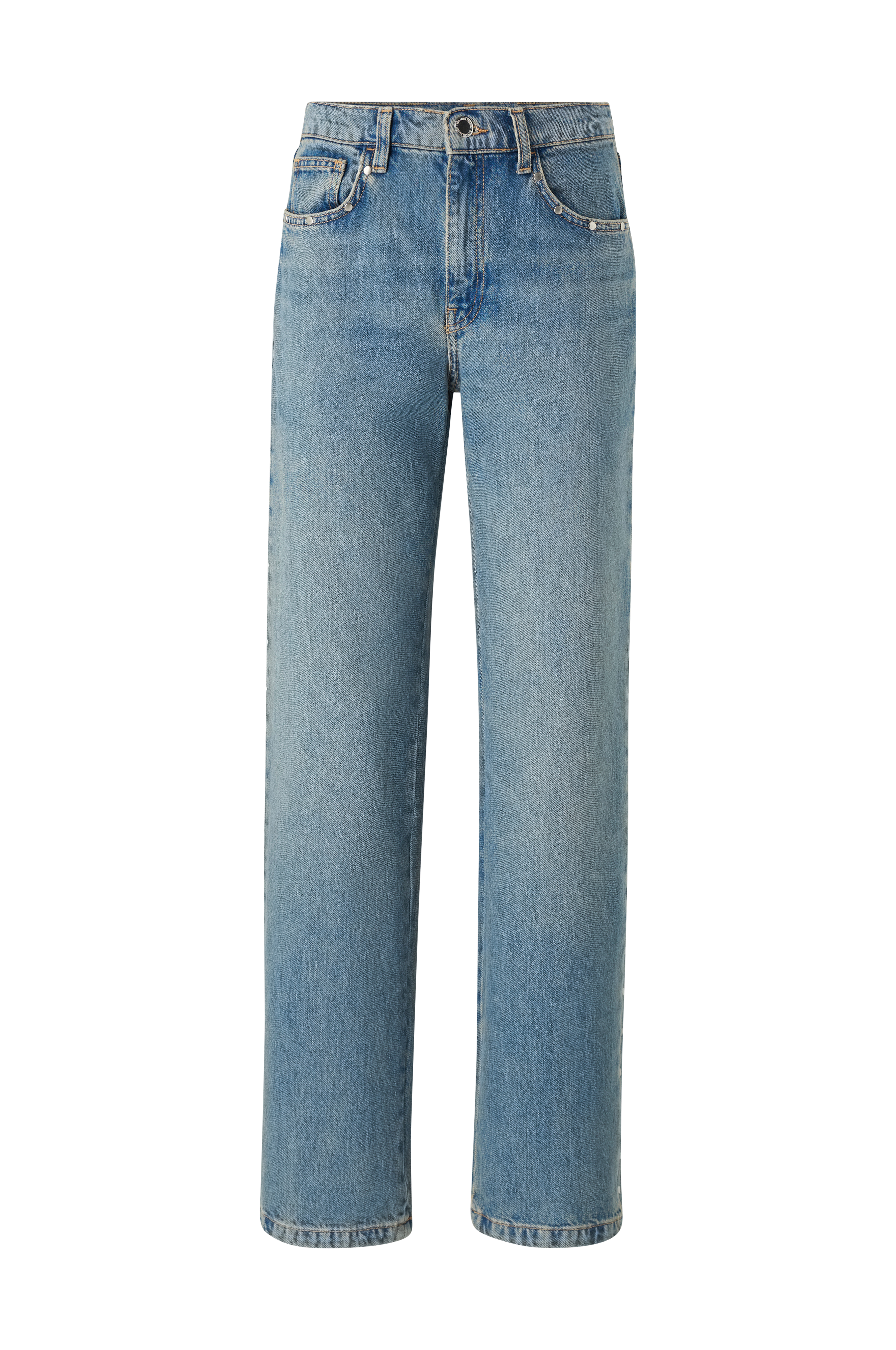 • Lige ben• Mediumhøj talje• Femlommemodel med dekorative nitter langs benene og på lommerne• Gylp med lynlås• Indre benlængde: 81 cm i størrelse 36