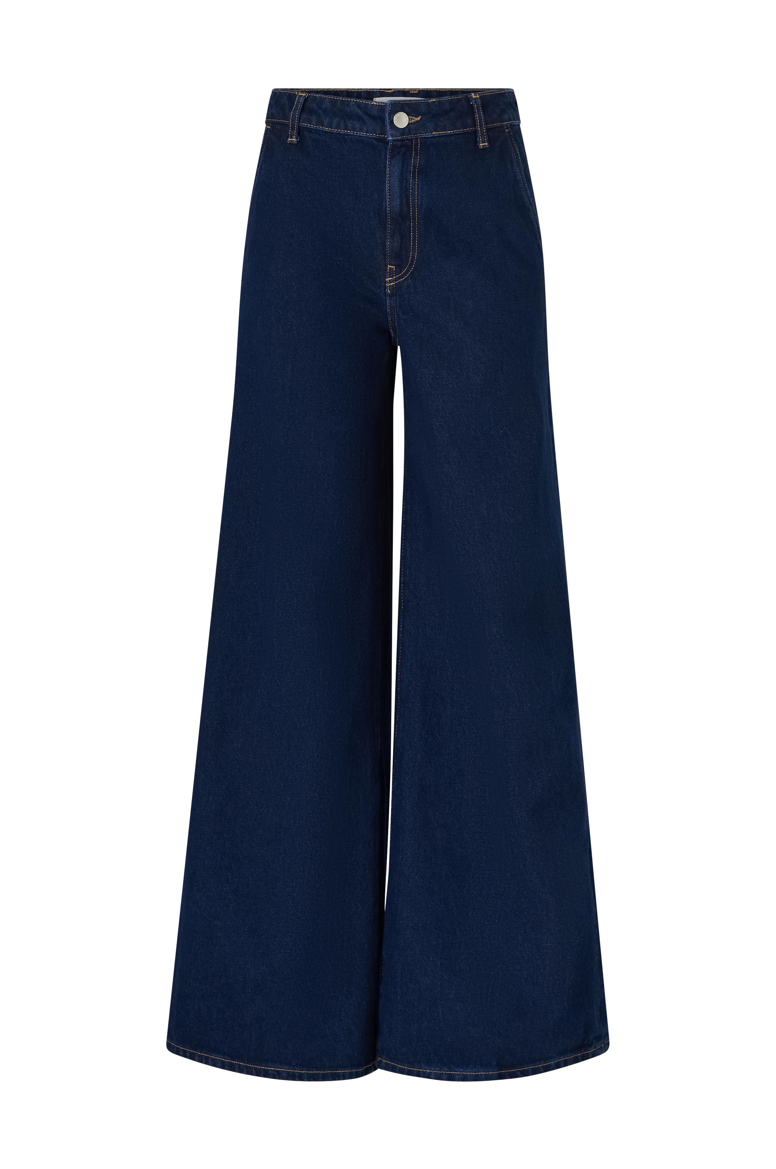 En meget flot jeans i mørkeblå. Der er ikke stretch i stoffet, men den er normal i størrelsen. Den sidder meget pænt og godt oppe og har ret vide ben, hvilket er meget flot. Lidt lan…