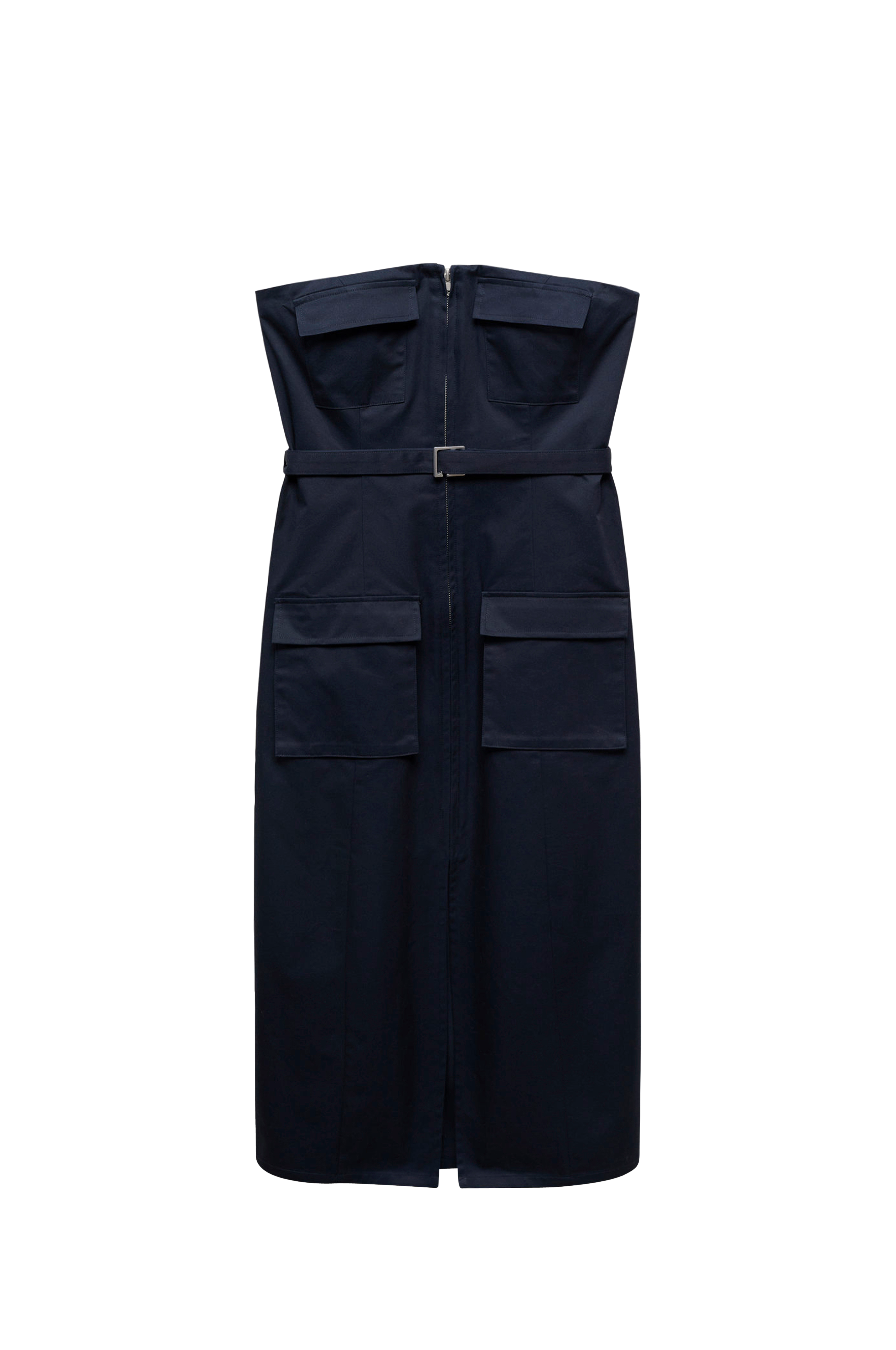 • Ærmeløs kjole• Lynlås foran• Indre silikonekant på toppen• Aftageligt bælte• To påsyede lommer• Slids foran