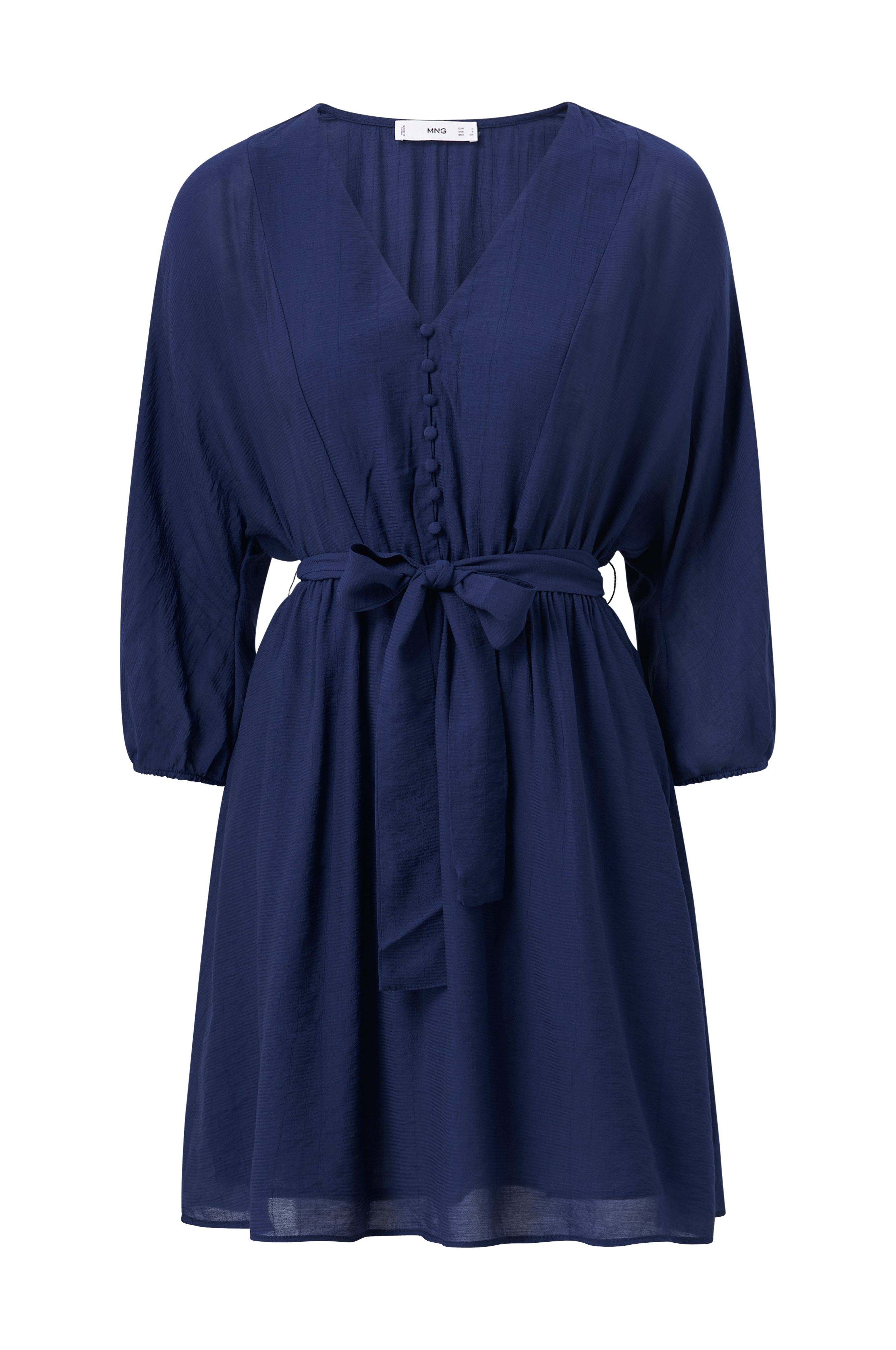 • Figurformede model• V-formet halsudskæring• Knaplukning foran ned til taljen med beklædte knapper• 3/4 langt kimonoærme med elastisk manchet• Elastisk talje med bæltespænde• Længde: 90 cm i størrelse S