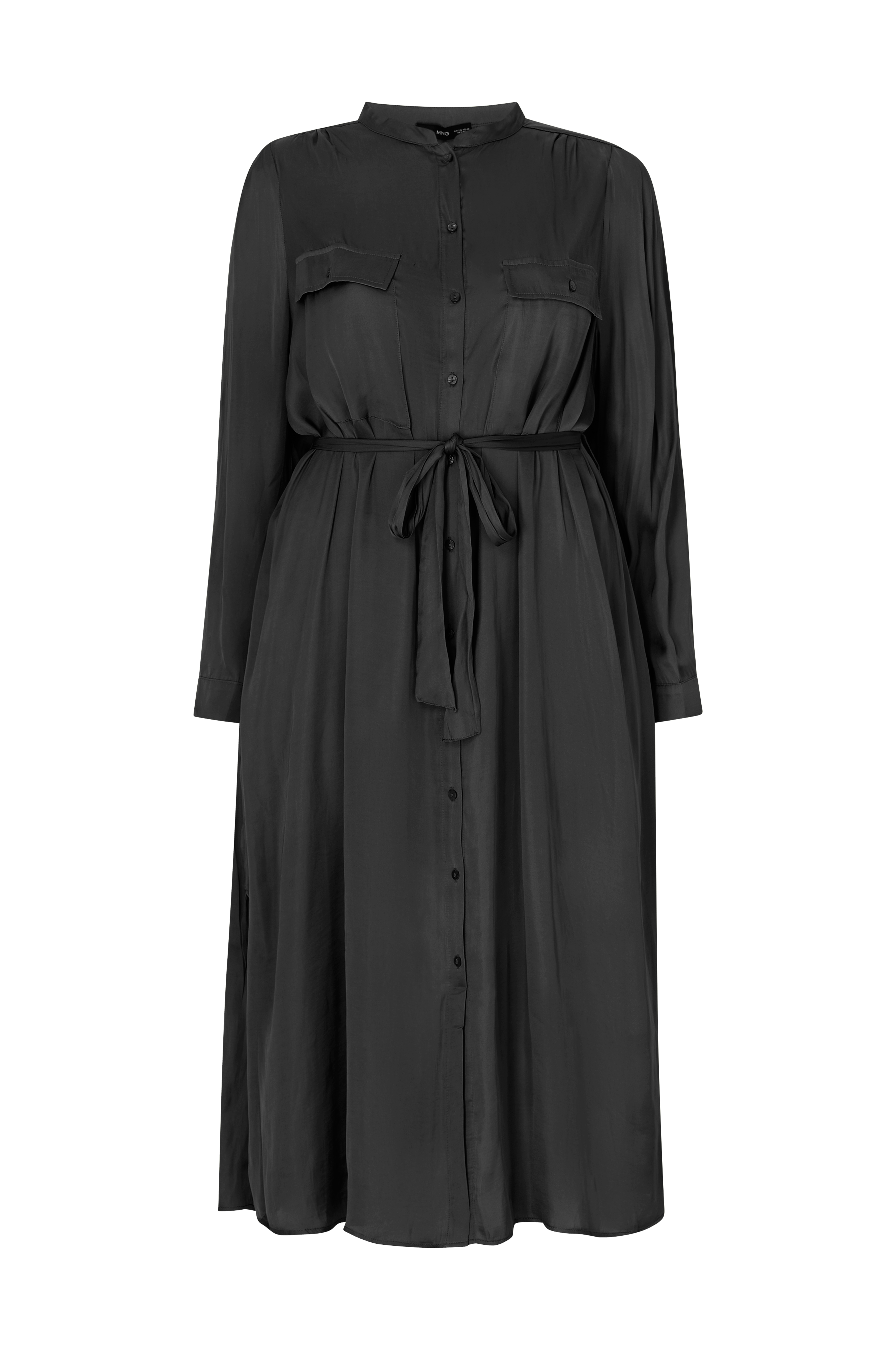• Store størrelser • Lang model i satin • Rund hals • Knapstolpe hele vejen frem • Brystlommer med låg • Elastisk smock bagpå ved taljen med syet bæltespænde • Langt ærme med manchet • Høje ventilationer nede i siderne • Længde: 126 cm i størrelse 2XL