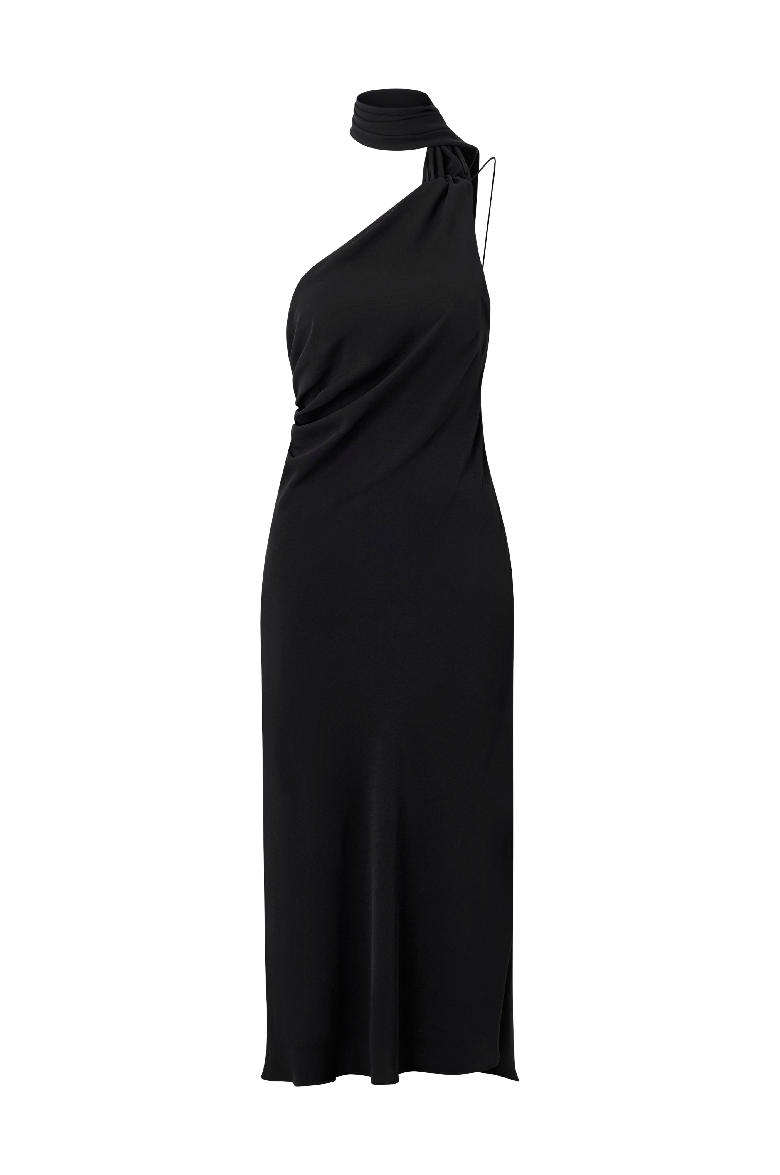 • Tynd, ærmeløs kjole med asymmetrisk design på toppen• Dekorativt tørklæde rundt om halsen• Smalle skulderstropper• Åben ryg• Samling ved skulderen og i den ene side• Lynlås i den ene side• Længde: 109 cm i størrelse S