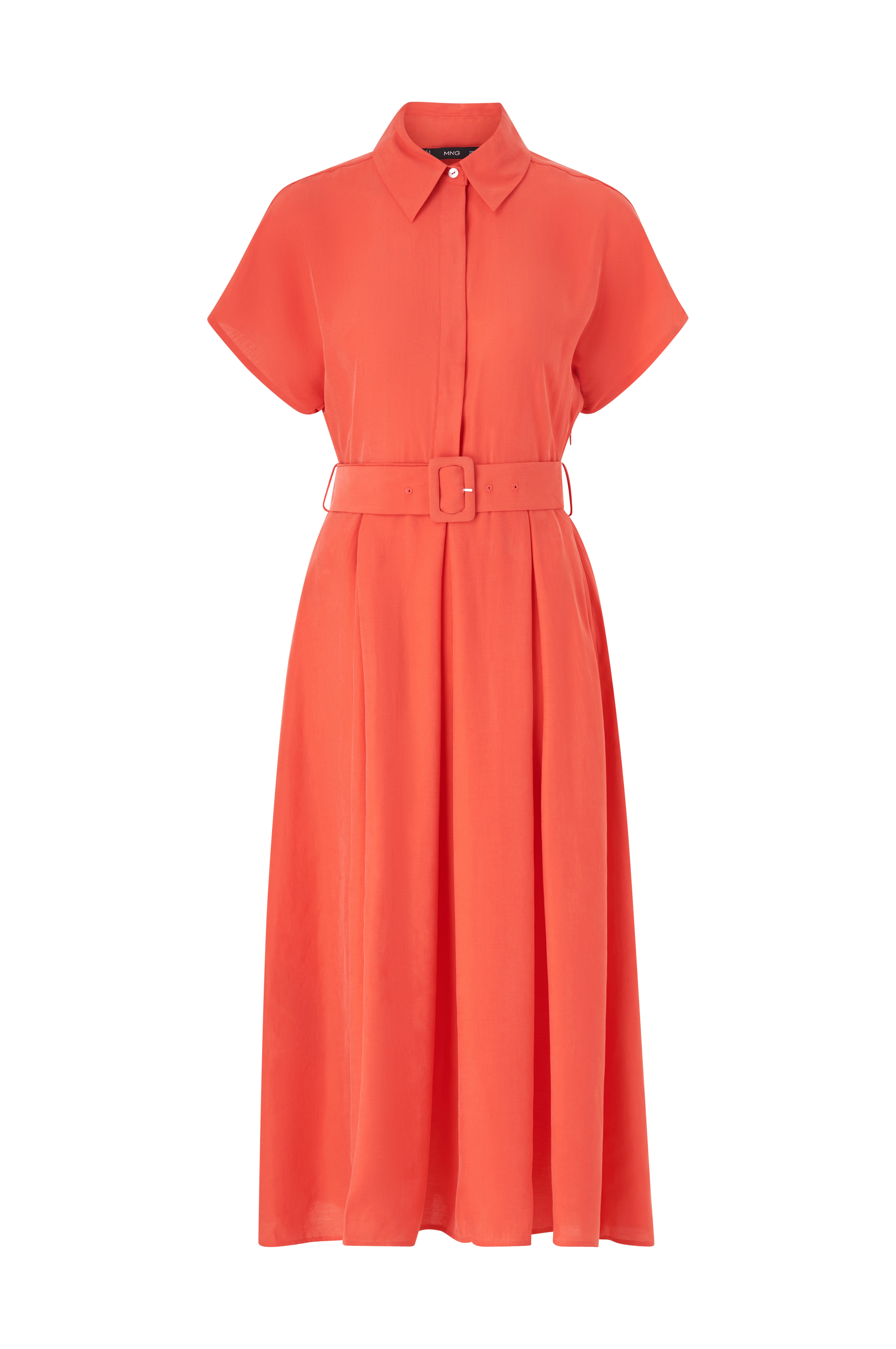 • Figurformede model• Skjortekrave• Knaplukning foran med skjulte knapper ned til taljen• Kort kimonoærme• Talje med modfold og bælte med spænde• Længde: 126 cm i størrelse S