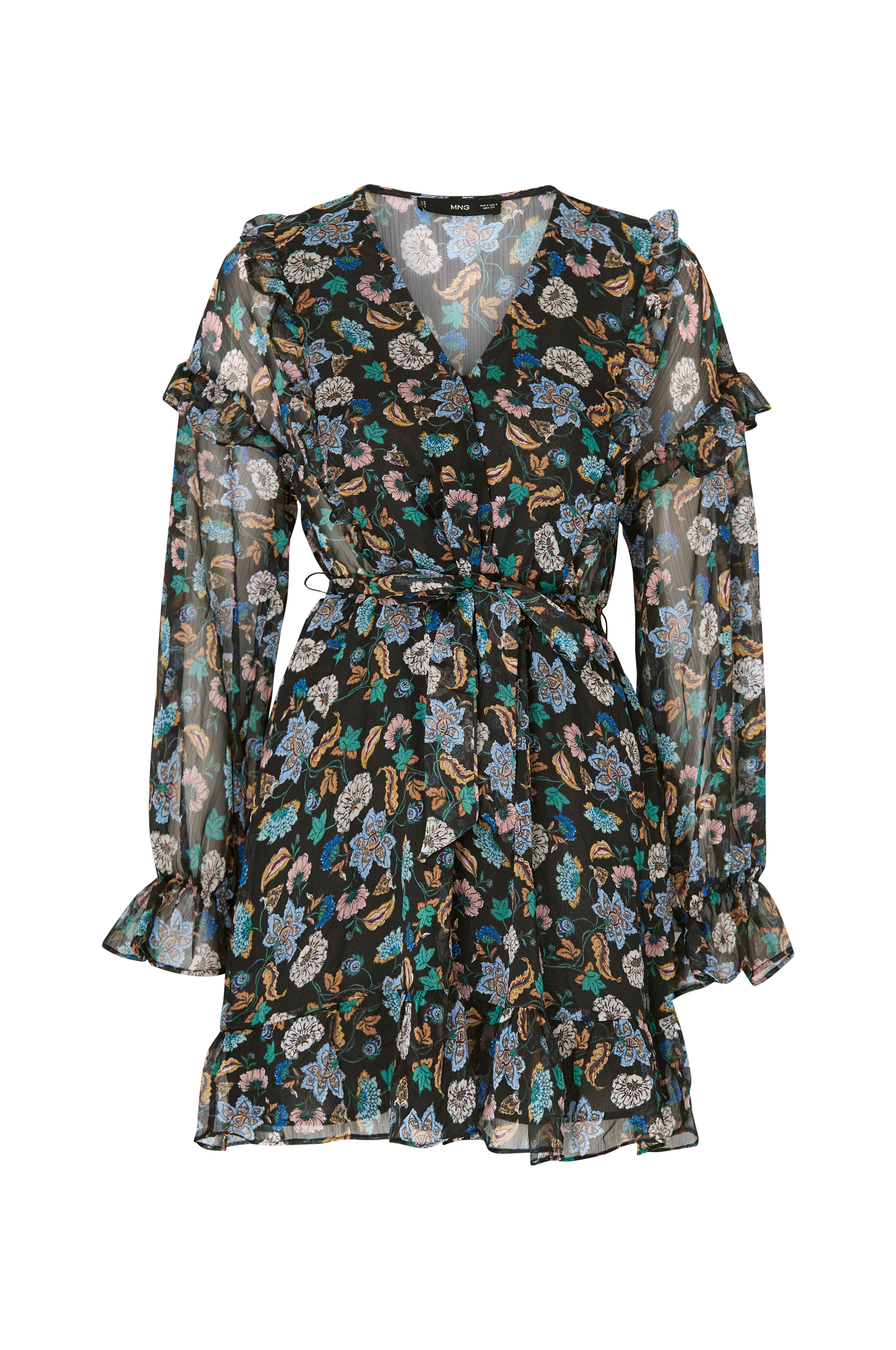 • Kort kjole i chiffon• V-udskæring med slå-om• Elastisk talje med bindebælte• Lange ballonærmer med volant ved manchetterne• Volanter på skuldrene og nederst• Foret nedre del• Længde: 84 cm i størrelse S