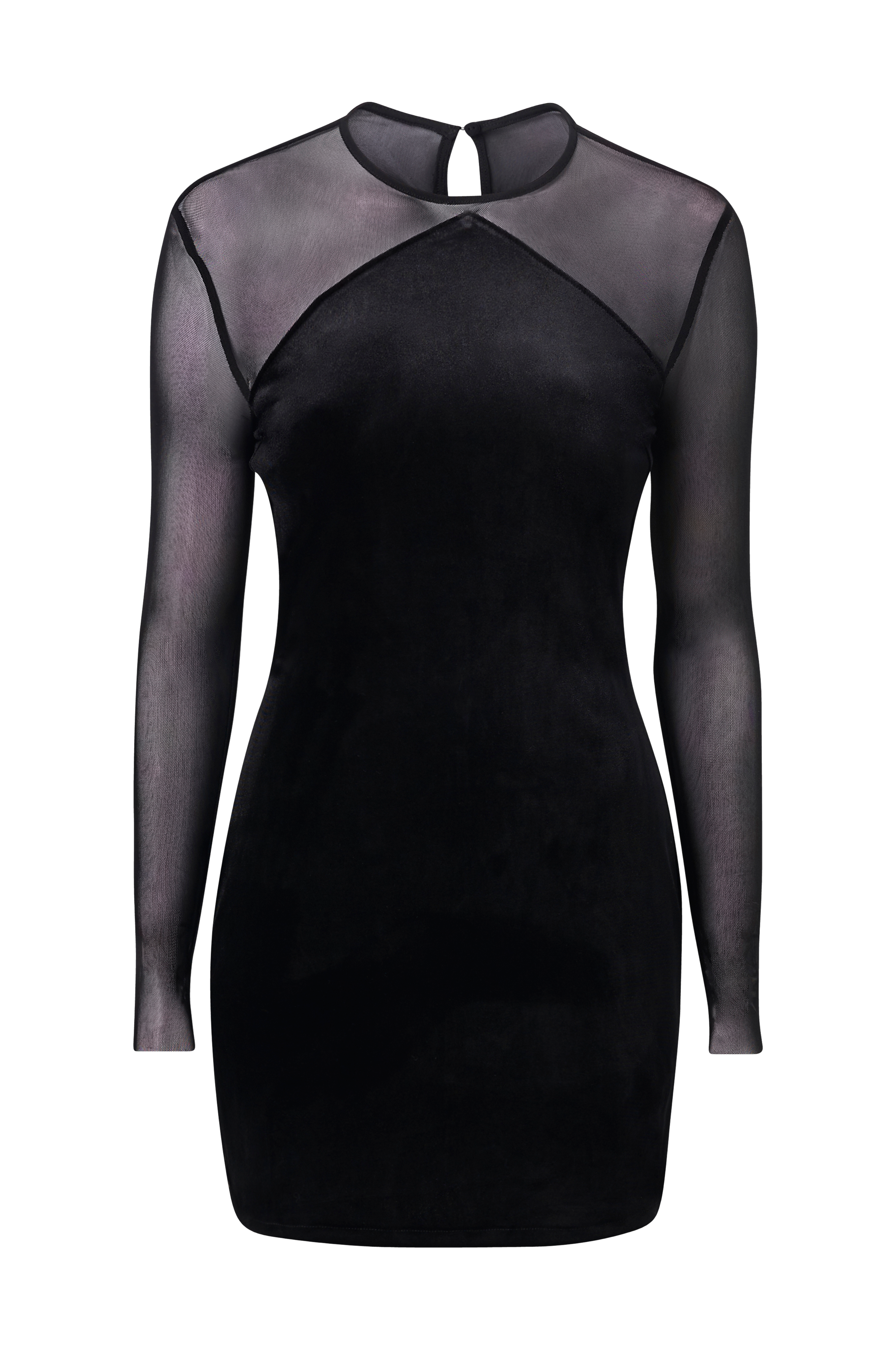 Kjole i blank, blød velour med ærmer og overdel i transparent mesh med stretch. Rund hals med slids og knap bagpå. Længde ca. 83 cm i str. S.
