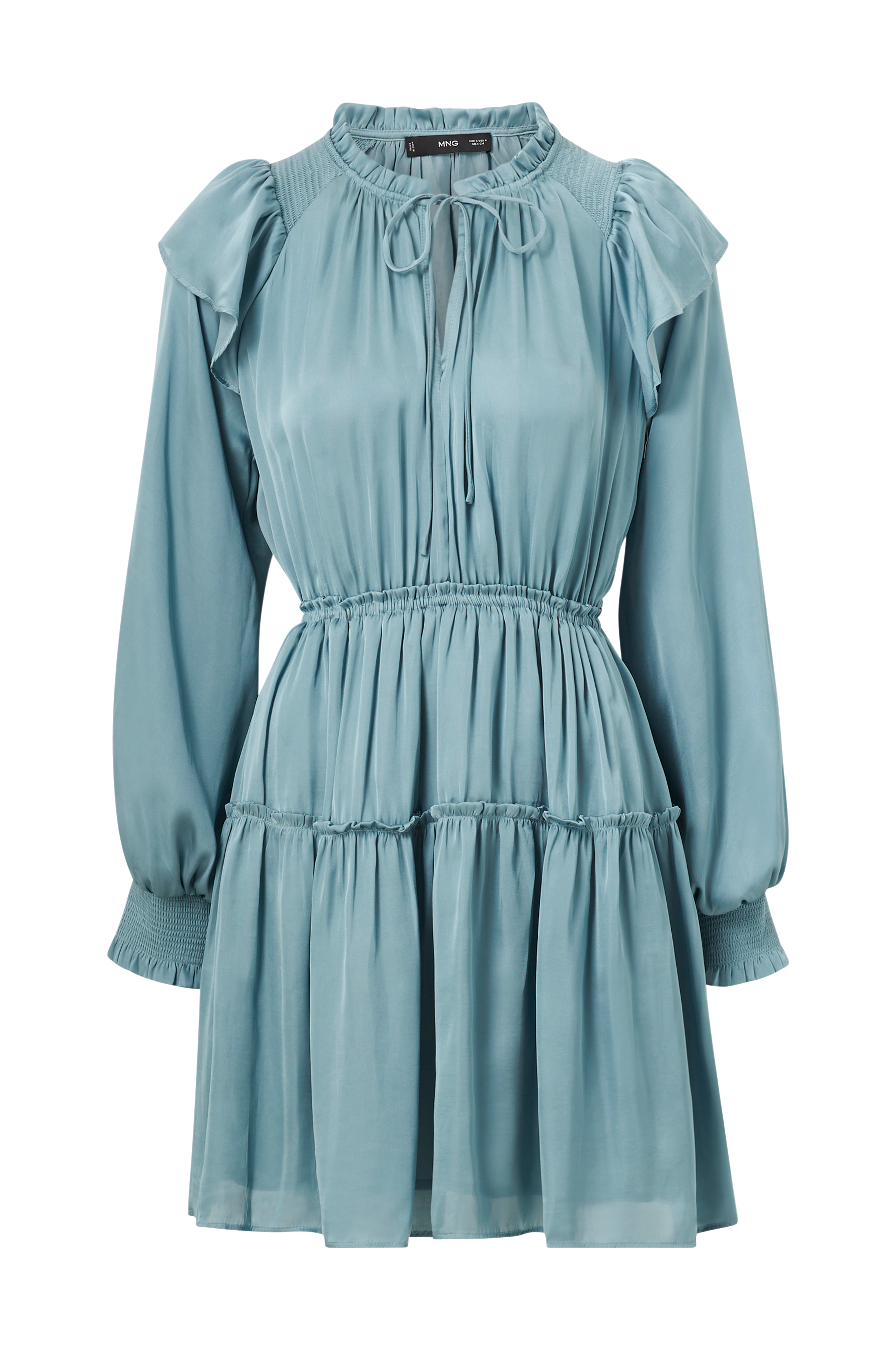 • V-udskæring• Ventilation med bindebånd foran• Volanter på skuldrene• Ballonærmer med smock ved manchetterne• Elastisk talje• Smock på skuldrene• Kvalitet med glans• Længde: 87 cm i størrelse S