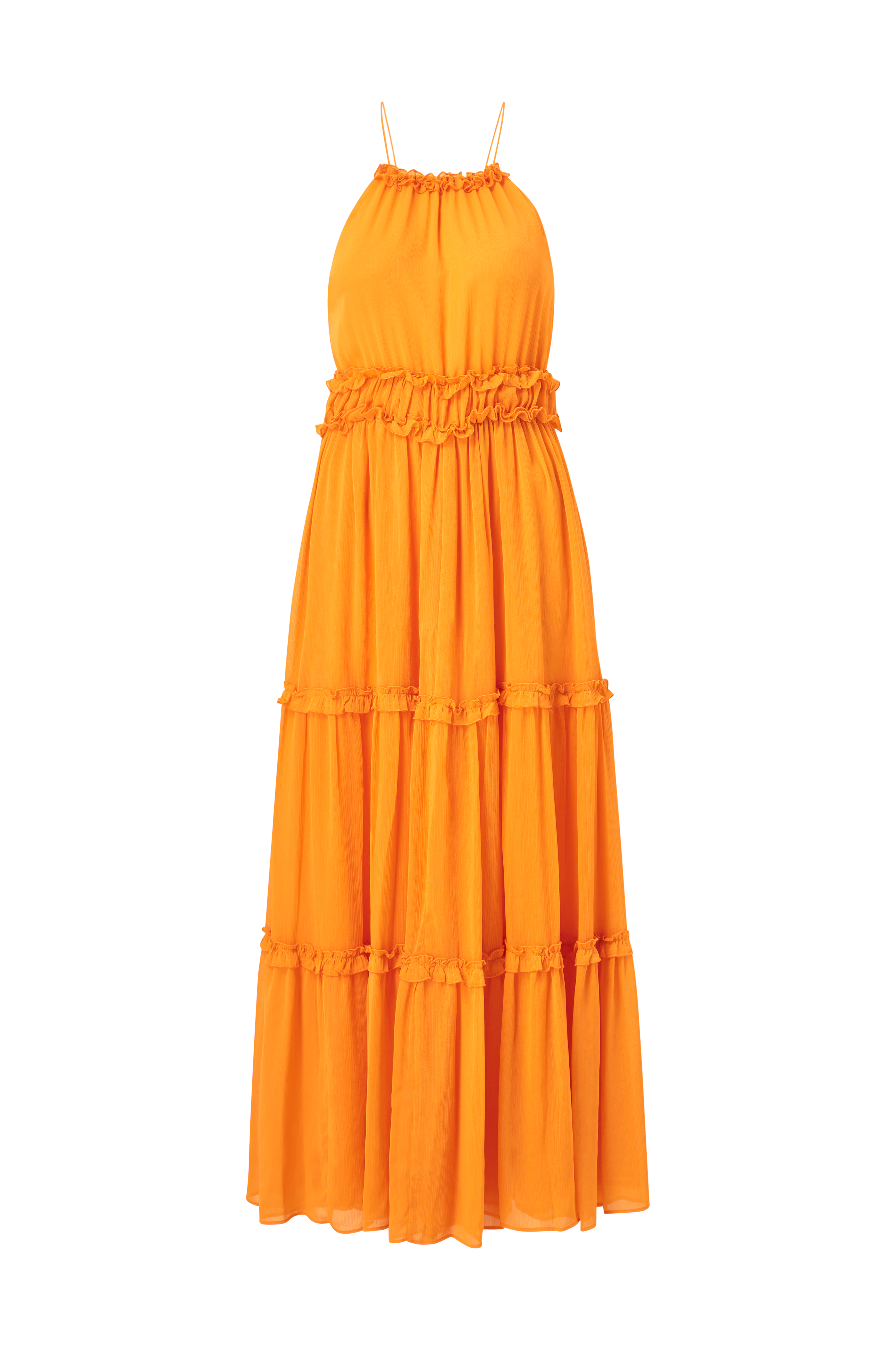 • Ærmeløs maxi kjole • Tynde skulderstropper • Åbning oppe bagved med knap og bindebånd • Volanter hele vejen rundt • Underkjole • Lynlås i siden • Elastisk bånd ved taljen med volanter • Volanter på skørtet • Længde: 136 cm i størrelse S • Produktet indeholder genindvundet materiale, som genbruges for at reducere mængden af affald samtidigt med at der ikke anvendes nye ressourcer.