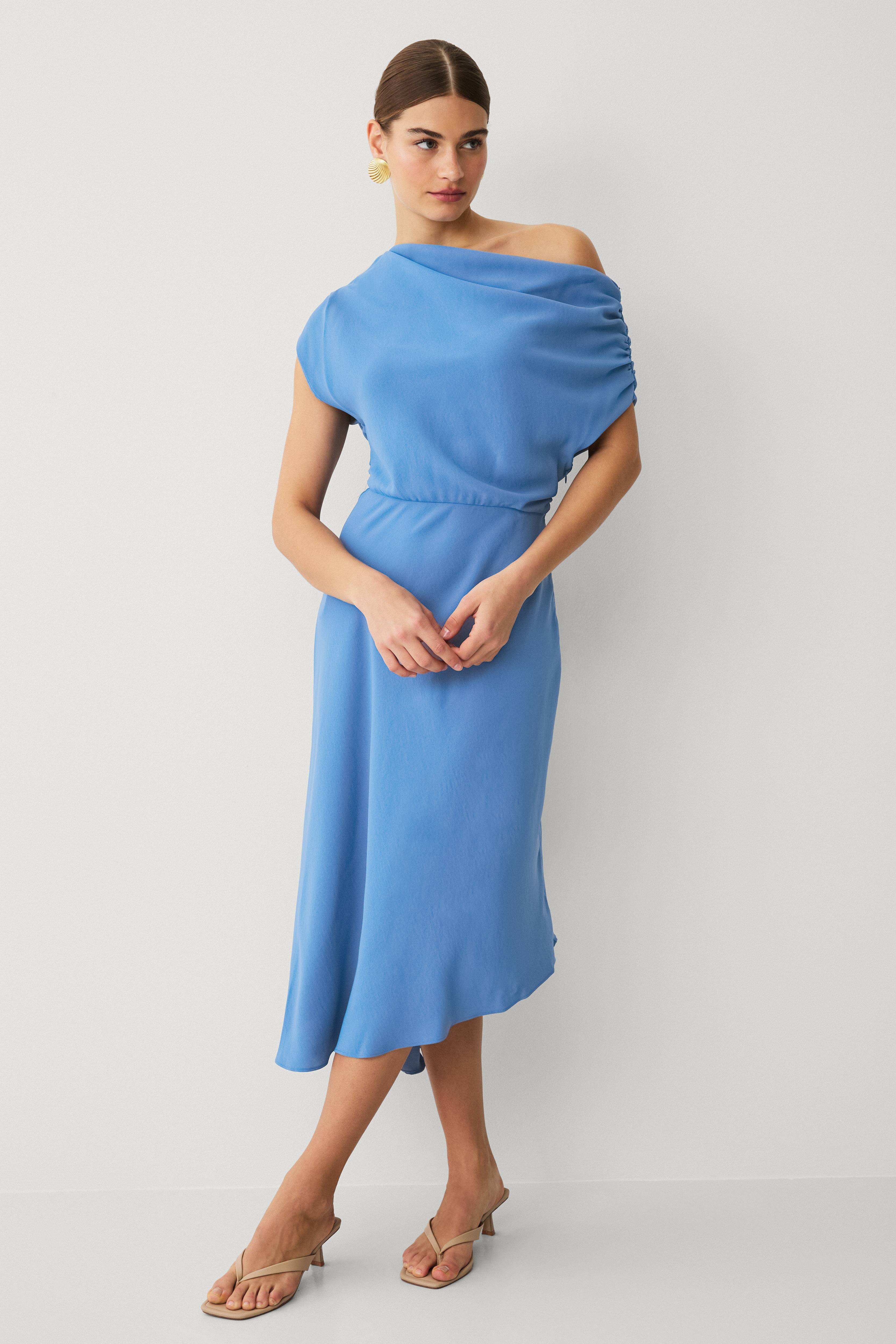 • Figursyet model med asymmetrisk pasform på toppen og ved nederste kant• Markeret talje med draperingsfolder i siderne• Længde: 150 cm i størrelse 36