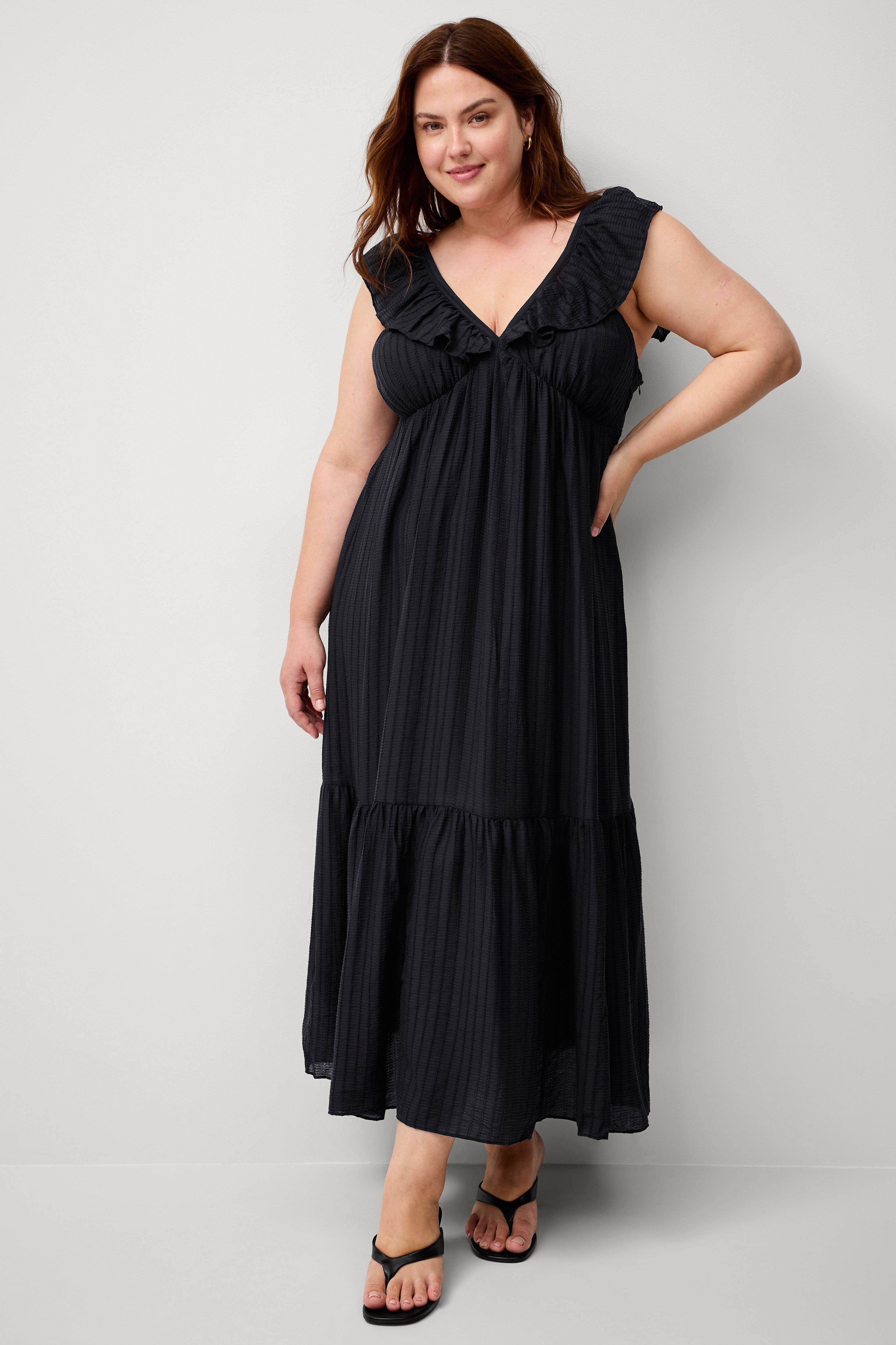 • Store størrelser• Ærmeløs model med volanter over skuldrene• Afrundet udskæring under brystet• Lige snit ryg• Bred volant ved nederste kant• Længde: 137 cm i størrelse XL