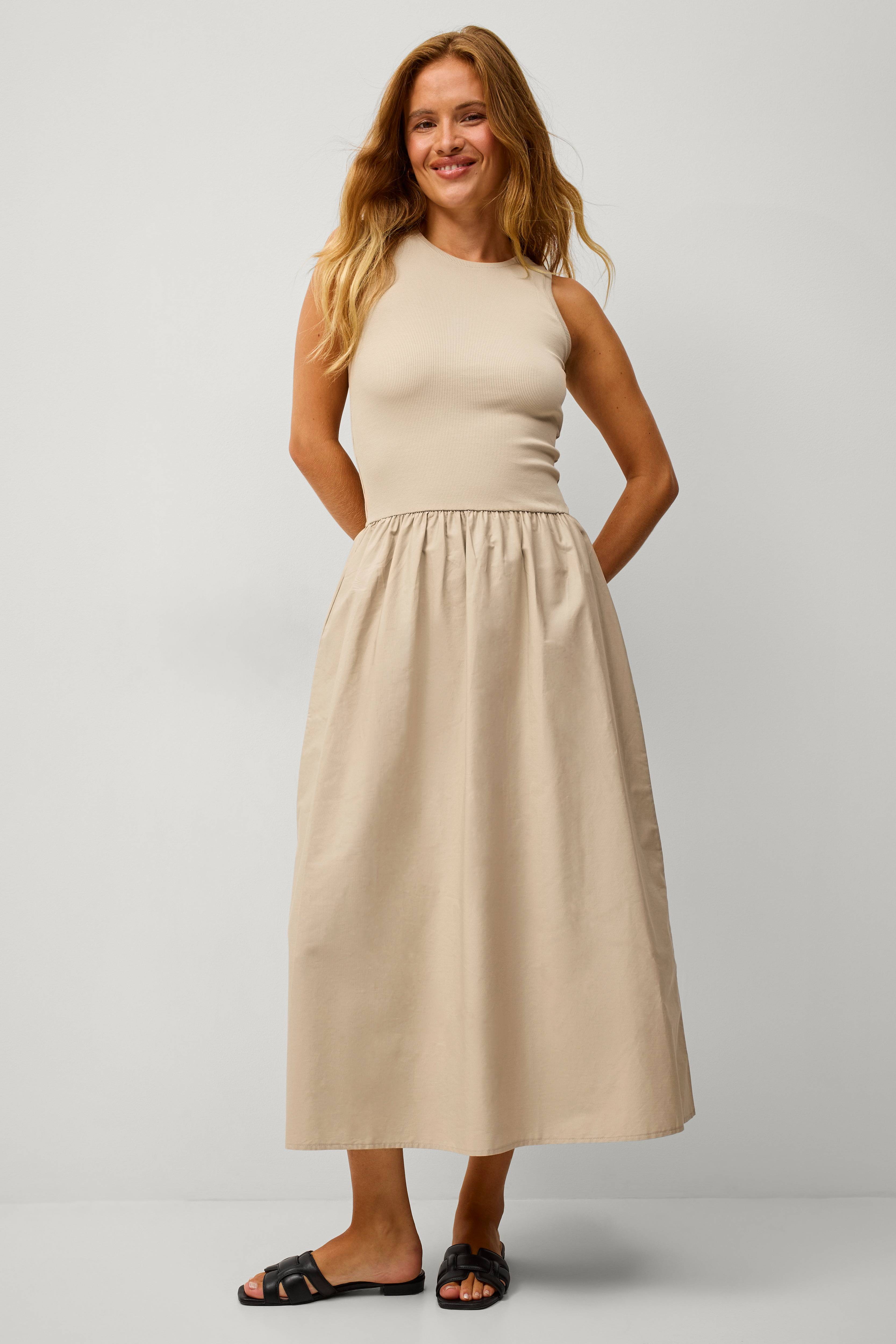 • Ribstrikket, figursyet øvre del i jersey• Elastisk talje• Vævet nederdel med meget vidde• Længde: 133 cm i størrelse S