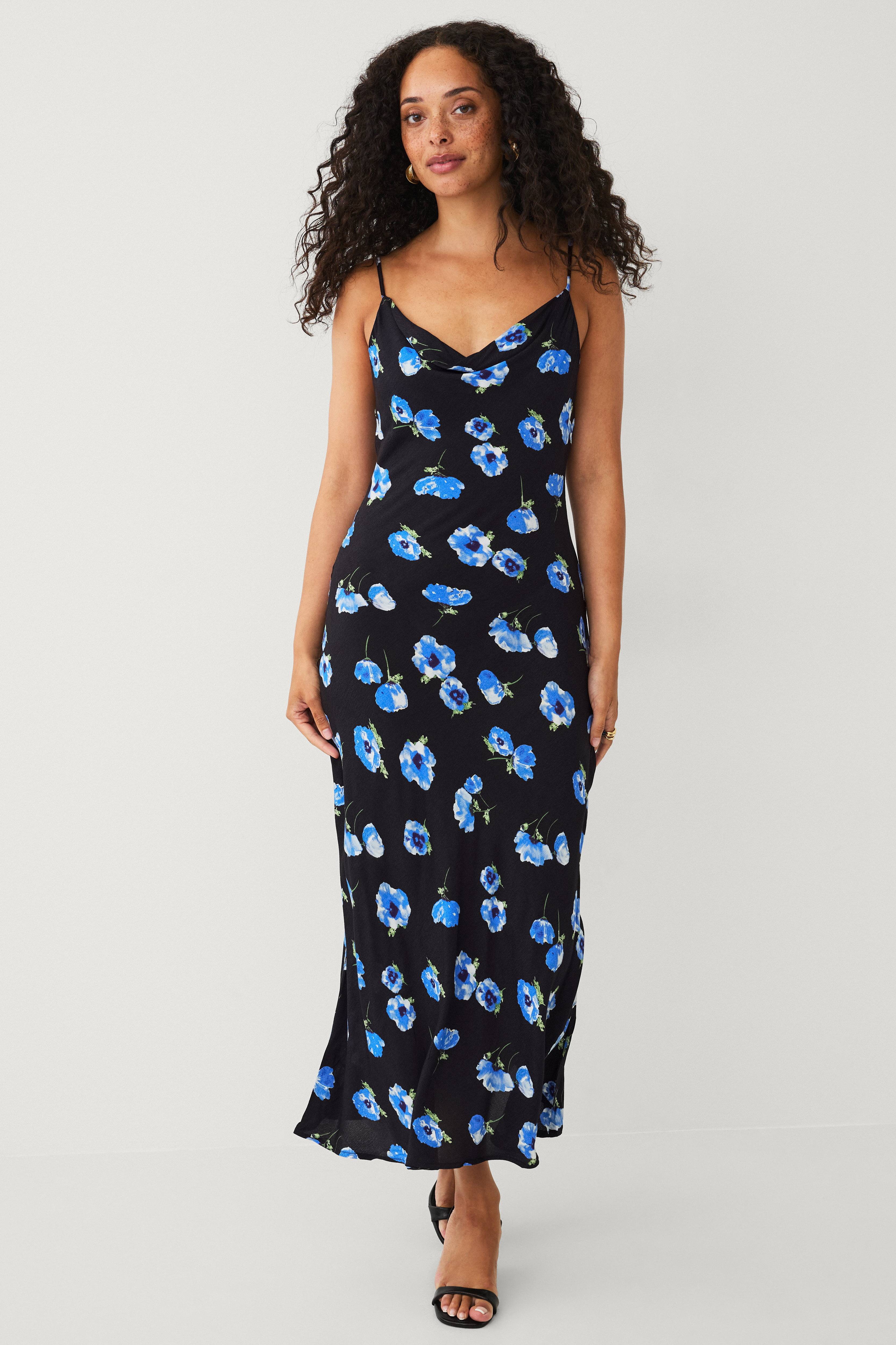 • Lang slipkjole med et blomstermønster• Justérbare, tynde skulderstropper• Draperet halsudskæring• Længde: 136 cm i størrelse S