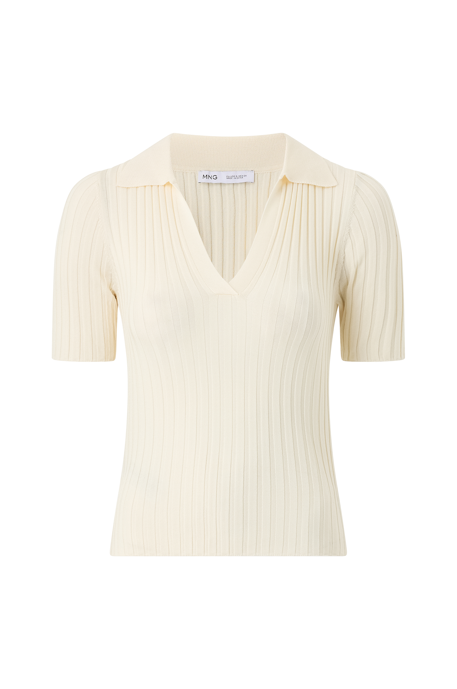 • Ribstrikket Pullover med figursyet pasform• V-formet halsudskæring med krave• Korte ærmer