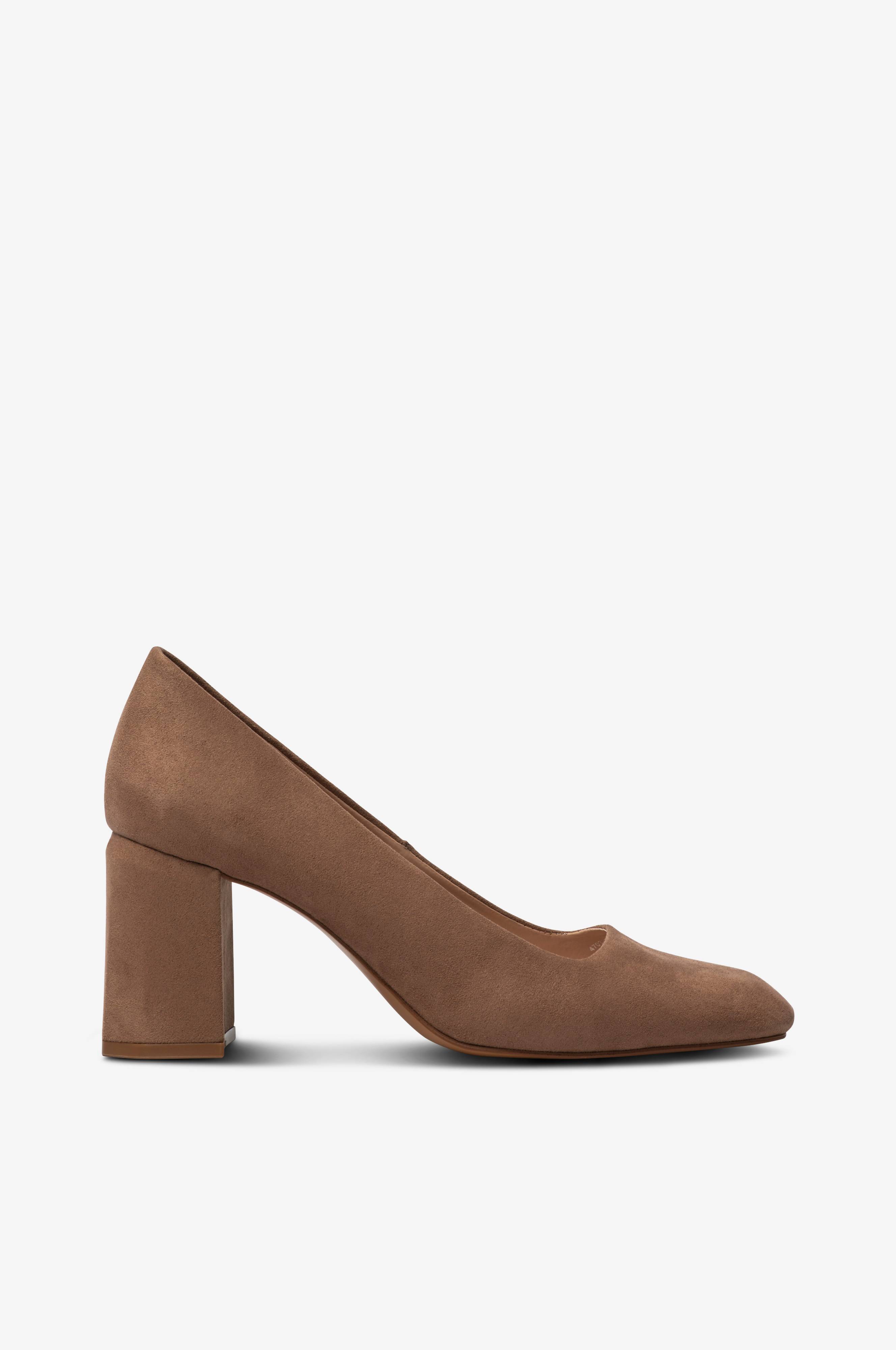 Høje pumps i blødt, imiteret ruskind med firkantet tå og beklædt blokhæl. Hælhøjde ca. 7,5 cm.