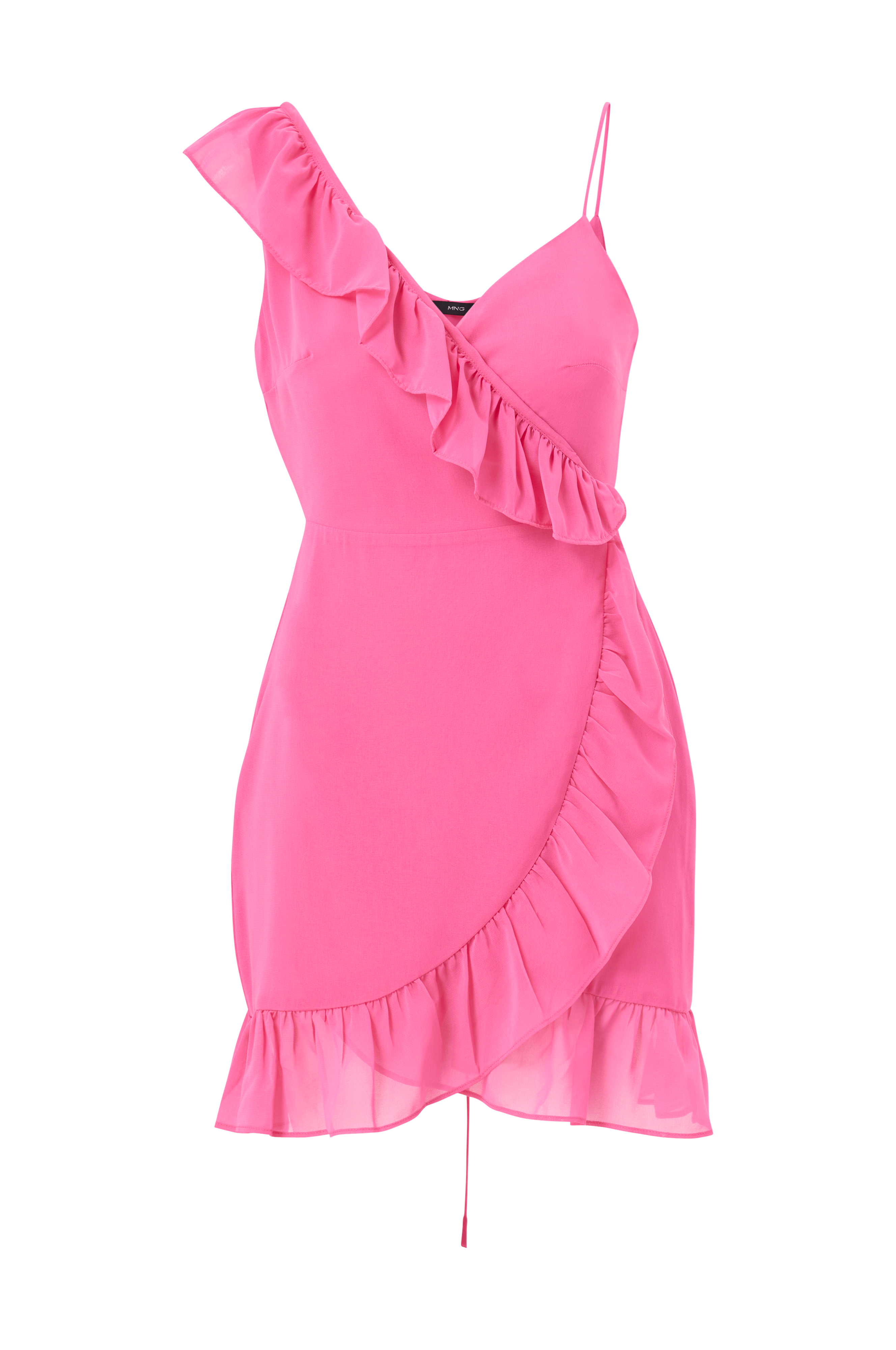 Kort kjole i slå-om-design med bindebånd i den ene side. Et smal skulderstrop og en bredere skulderstrop med flæse. Flæsedetaljer foran og i kant forneden. Foret nederdel. Længde ca. 81 cm i str. S.
