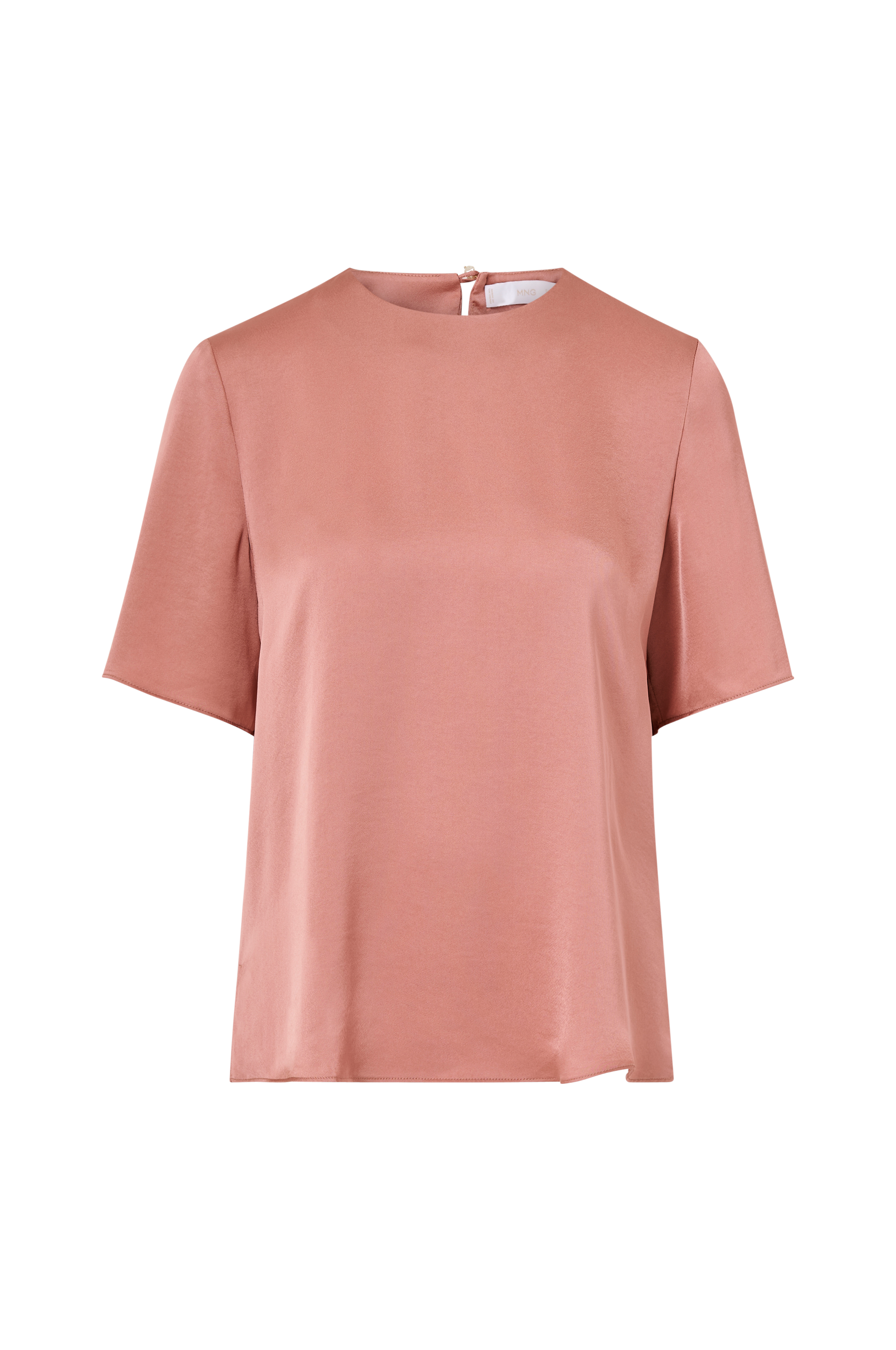 • Lige model i satin• Rund hals med knap i nakken• Kort ærme• Korte slidser nede i siderne