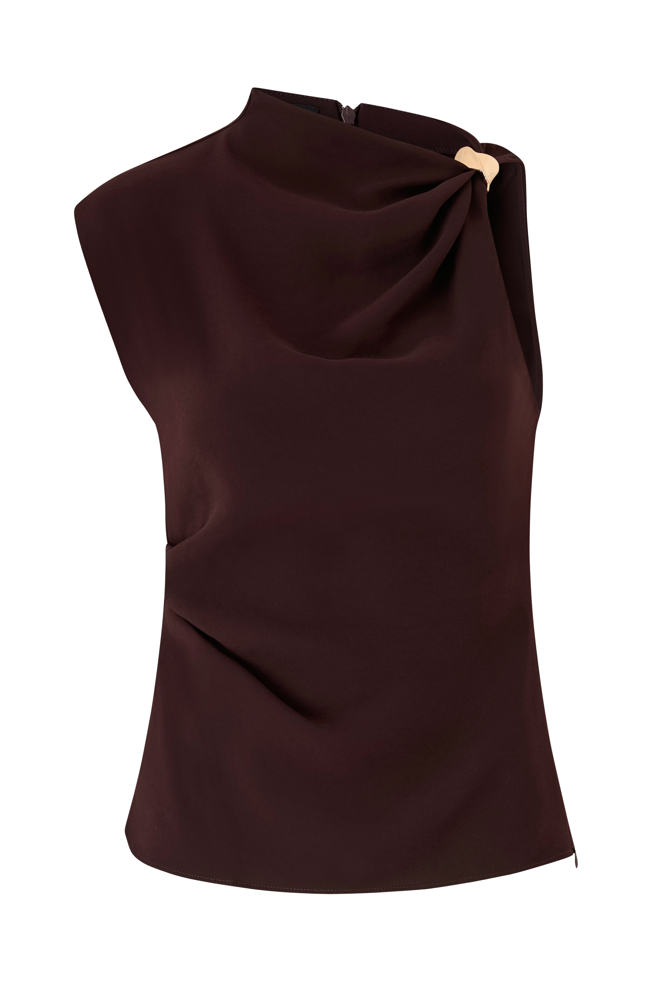 • Ærmeløs top med asymmetrisk halsudskæring• Dekorativt, guldfarvet metalspænde på en skulder• Opretstående krave• Drapering på en skulder og ved taljen• Lynlås i ryggen og i den ene side