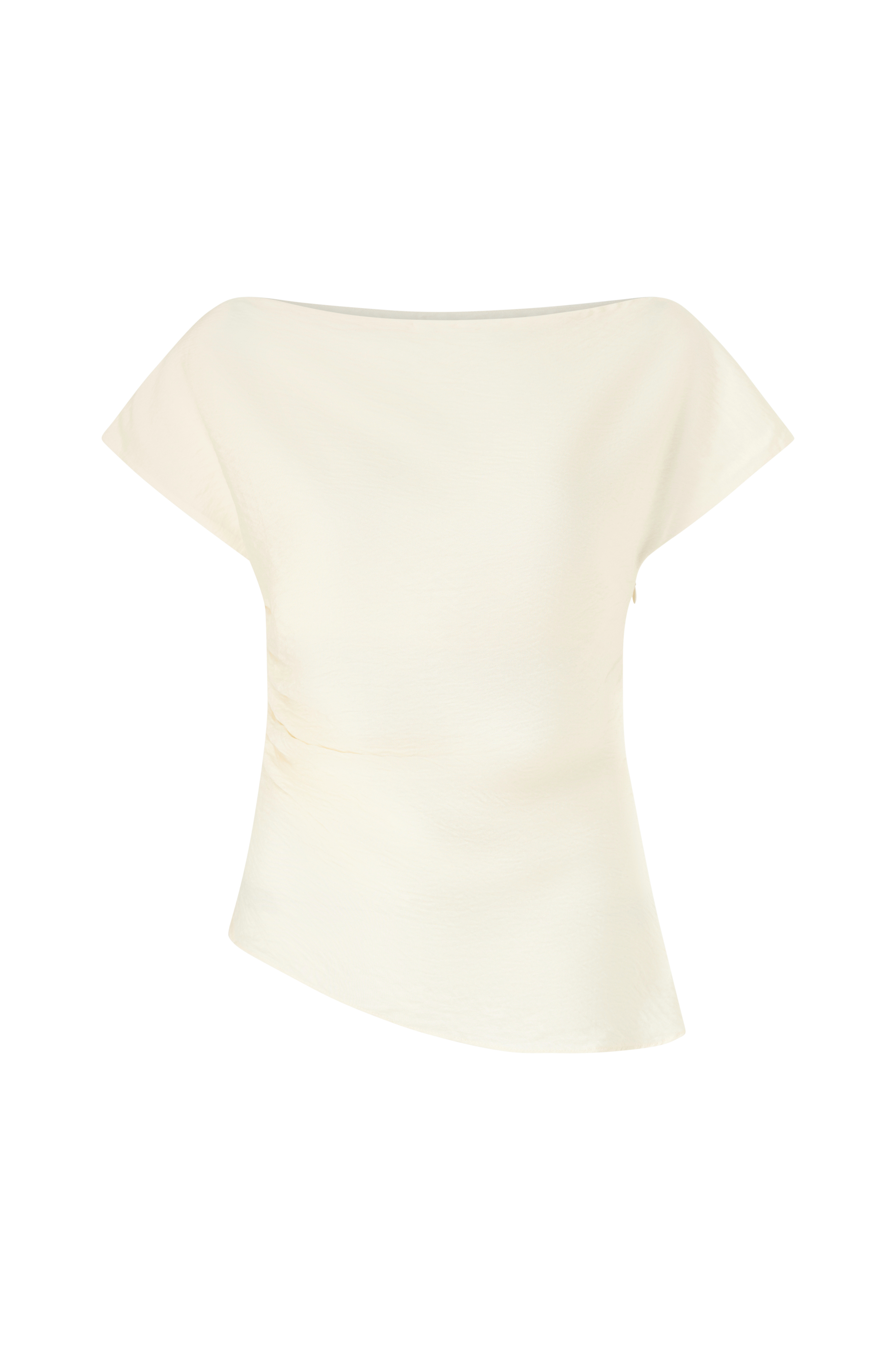 • Bred, draperet halsudskæring• Korte korte ærmer• Samling i den ene side• Lynlås i siden• Asymmetrisk nedre del