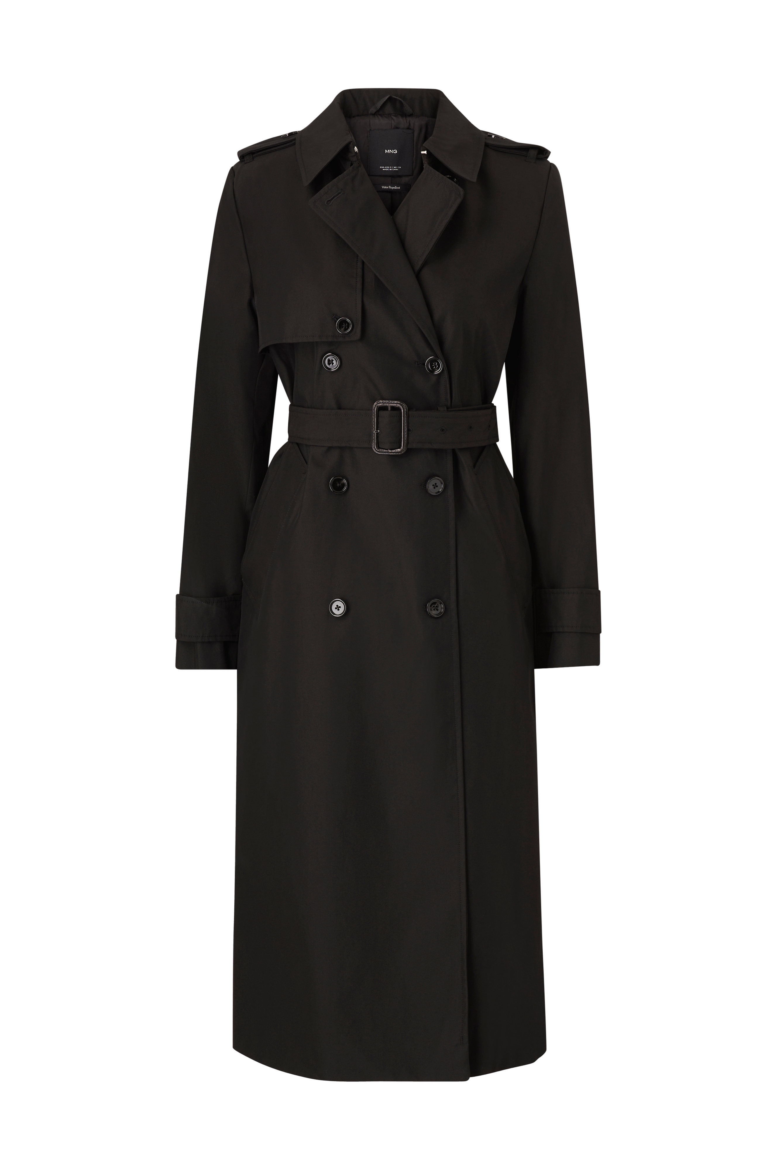 • Klassisk model med løstsiddende linning• Skulderstropper• Dobbelte knapper• Indlagt lomme• Strop nederst på ærmet• Stropper med bælte ved taljen• Høj slids nede bagved• Foret• Længde: 120 cm i størrelse S