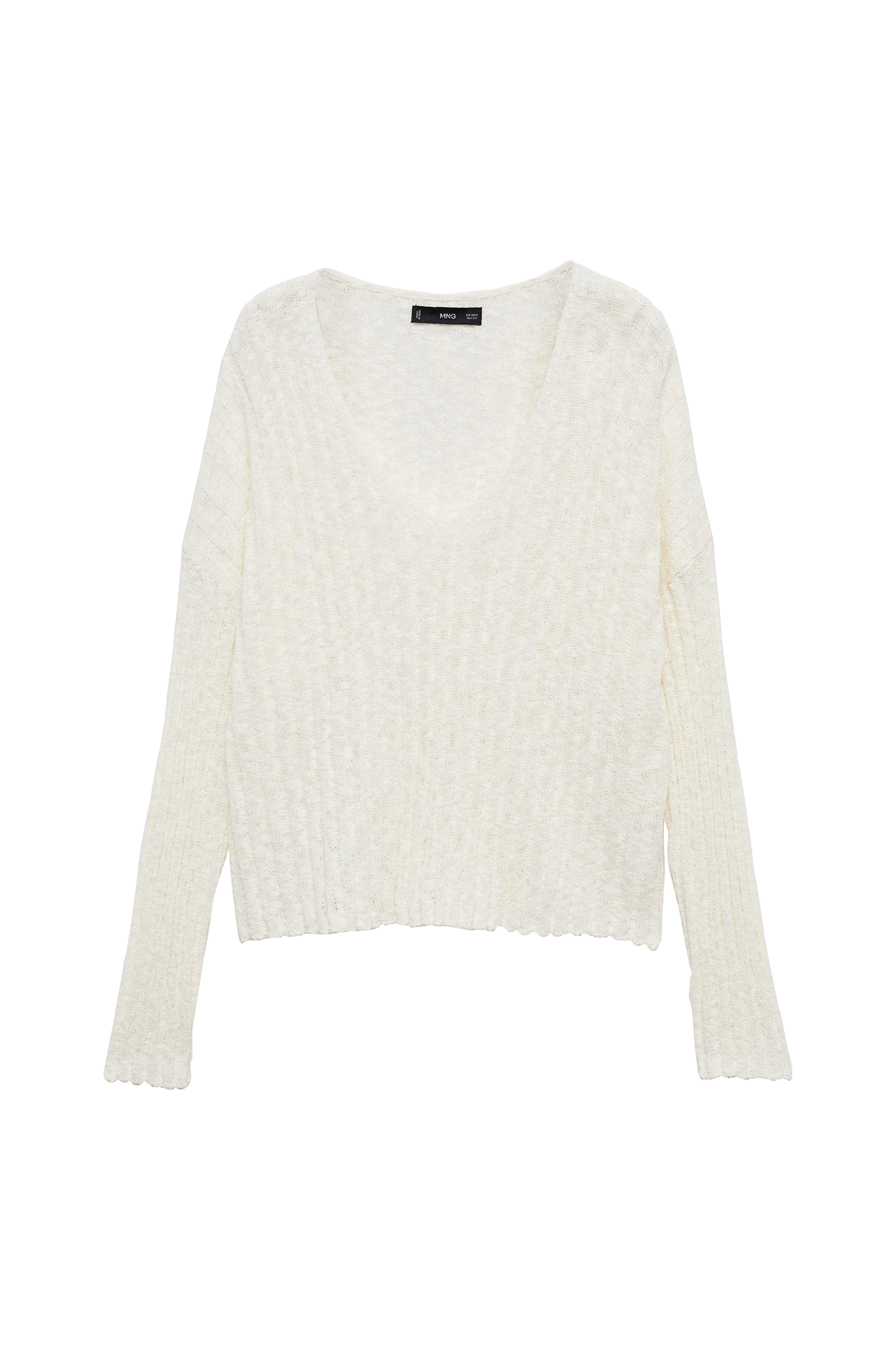 • Kort, ribstrikket model• V-formet halsudskæring• Nedsænket skulder med langt ærme