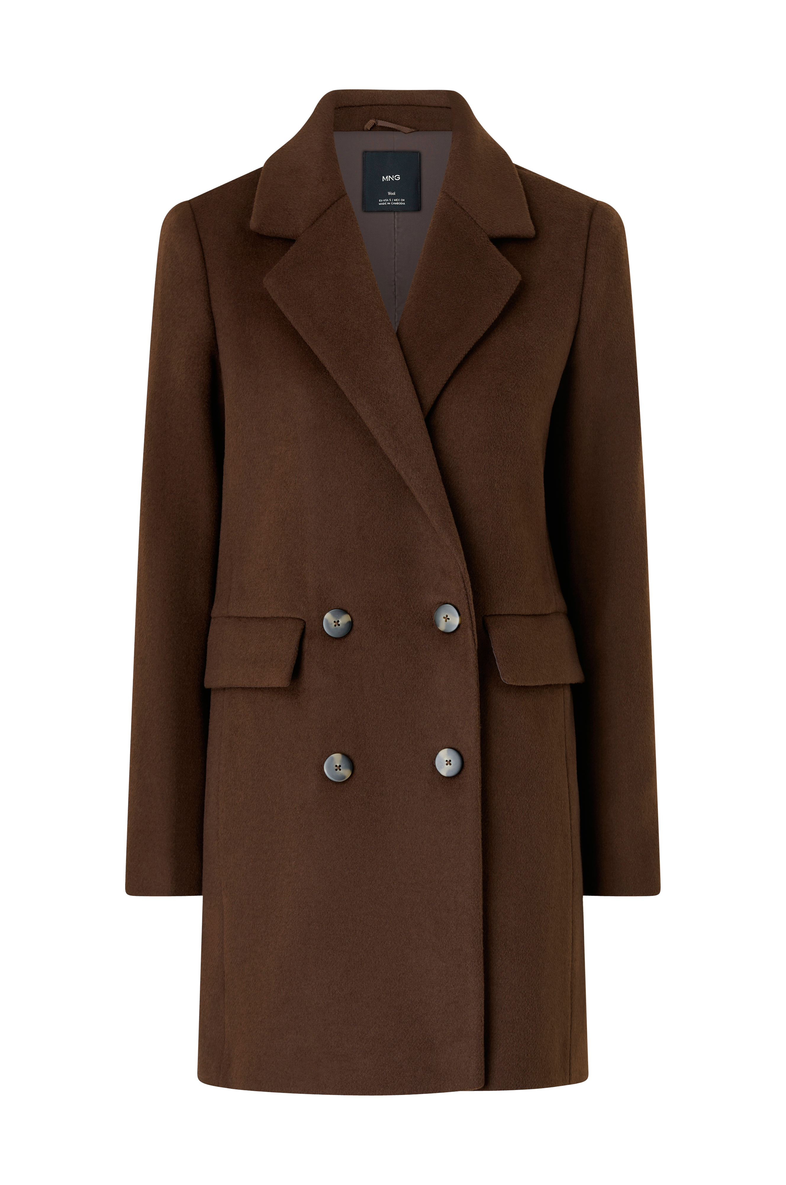 • Frakke i uldblanding med krave og revers• Knapper ved manchetterne• Dobbelt knaplukning• Tekstilforing• To paspolerede lommer med låg• Længde: 82 cm i størrelse S